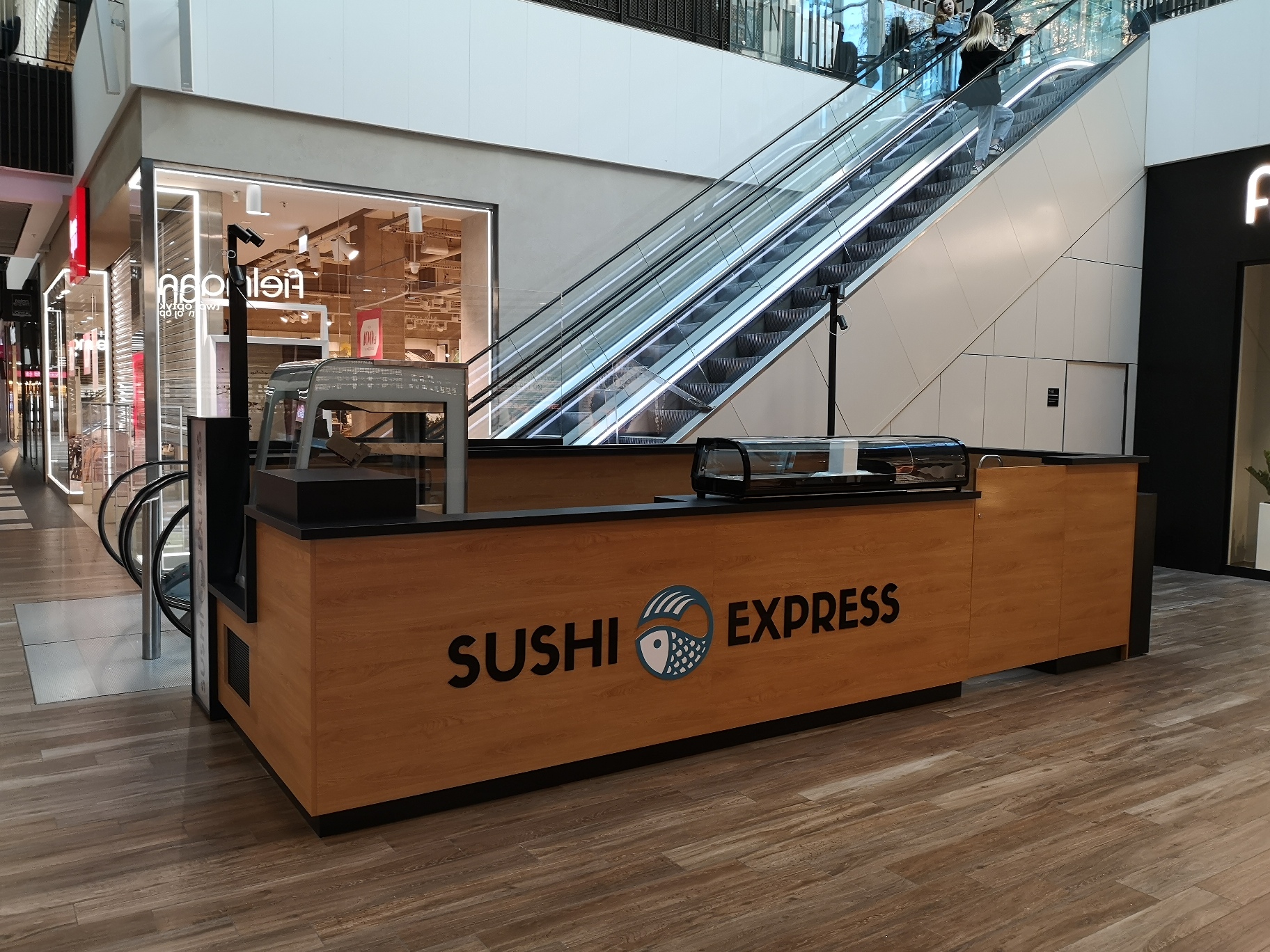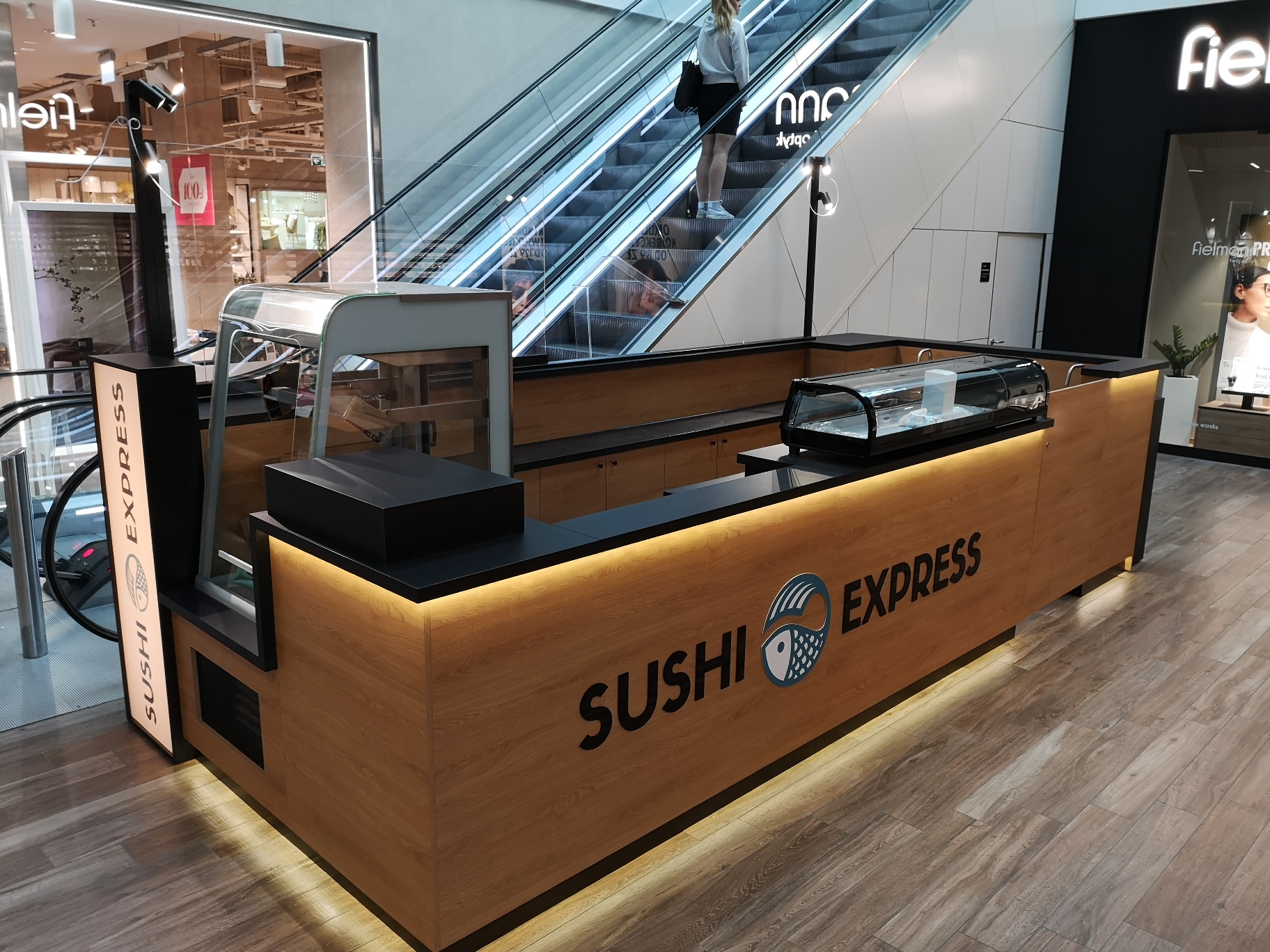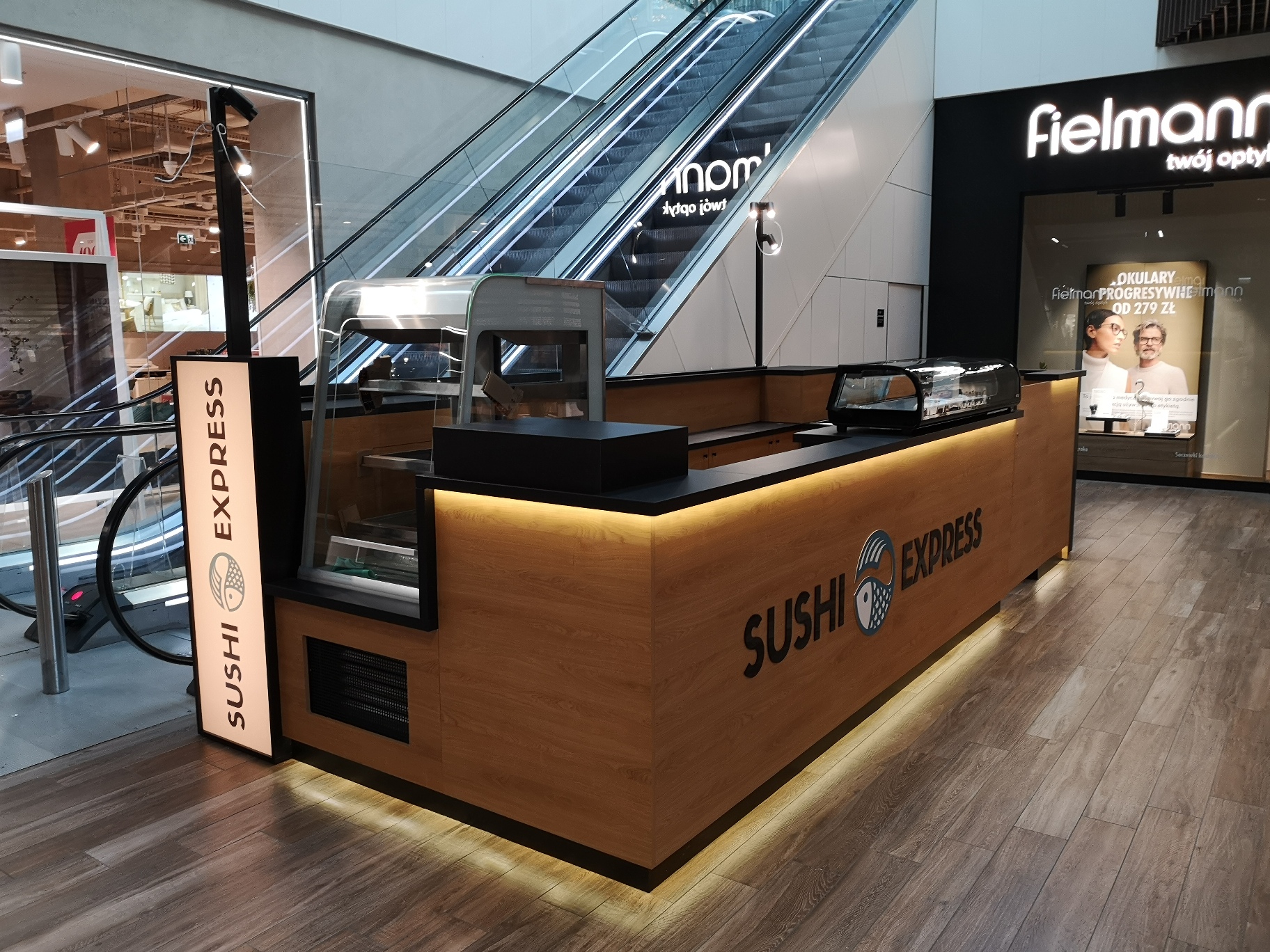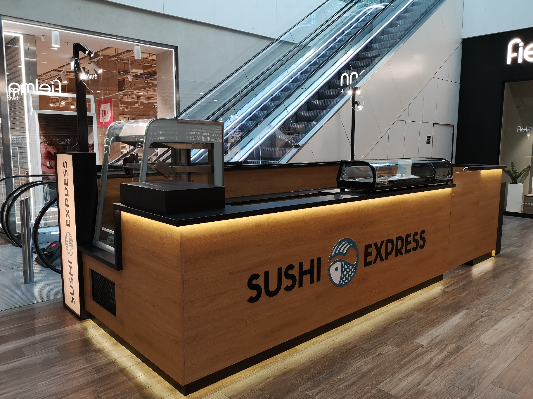 Nasze najnowsze wyzwanie to stoisko gastronomiczne dla marki Sushi Express w Galerii Handlowej Forum Gdańsk. Wąska przestrzeń pomiędzy schodami ruchomymi a korporacyjnym sklepem stworzyła jednocześnie wyjątkowe i wymagające warunki, które z sukcesem spełniliśmy, tworząc efektywną strefę produkcji i sprzedaży.