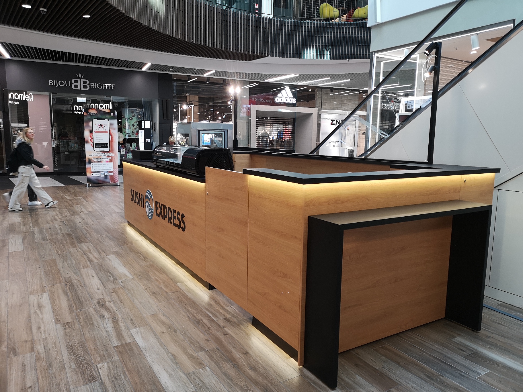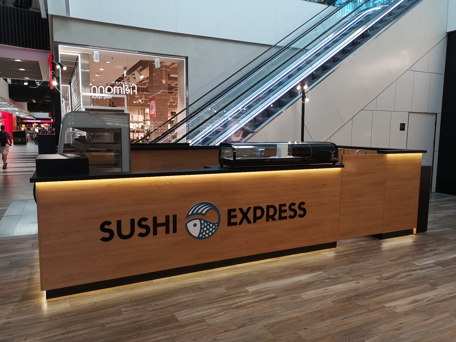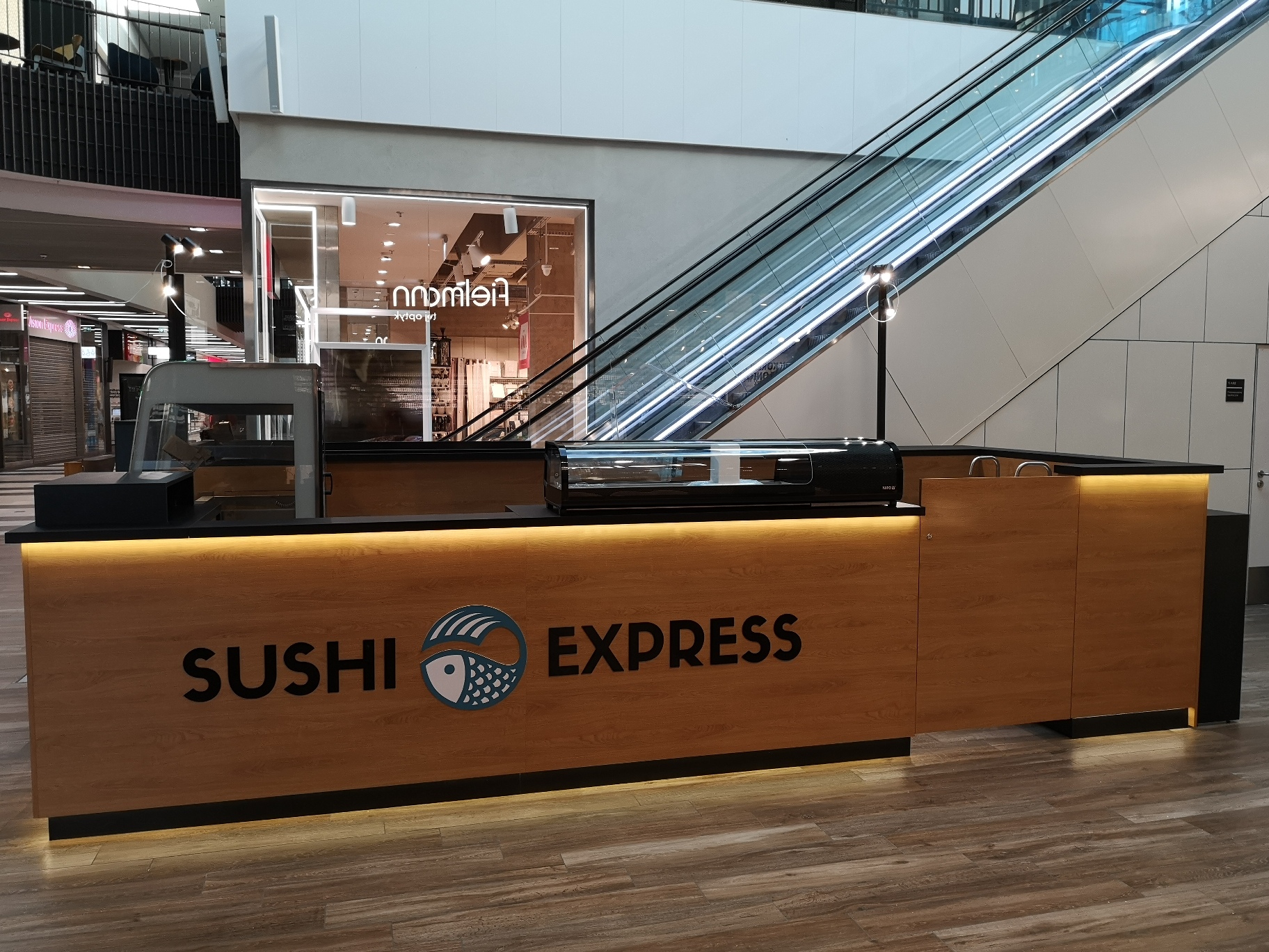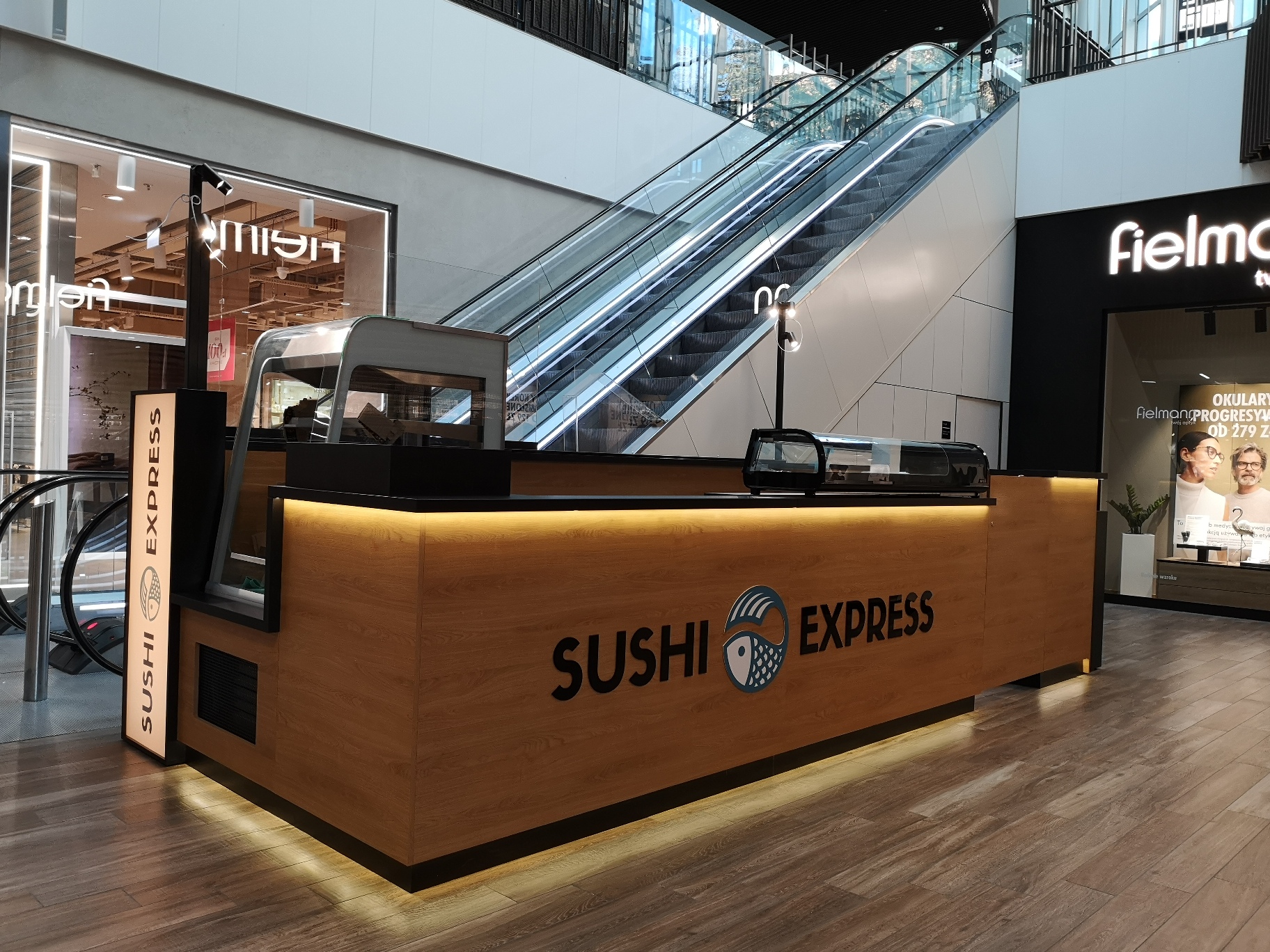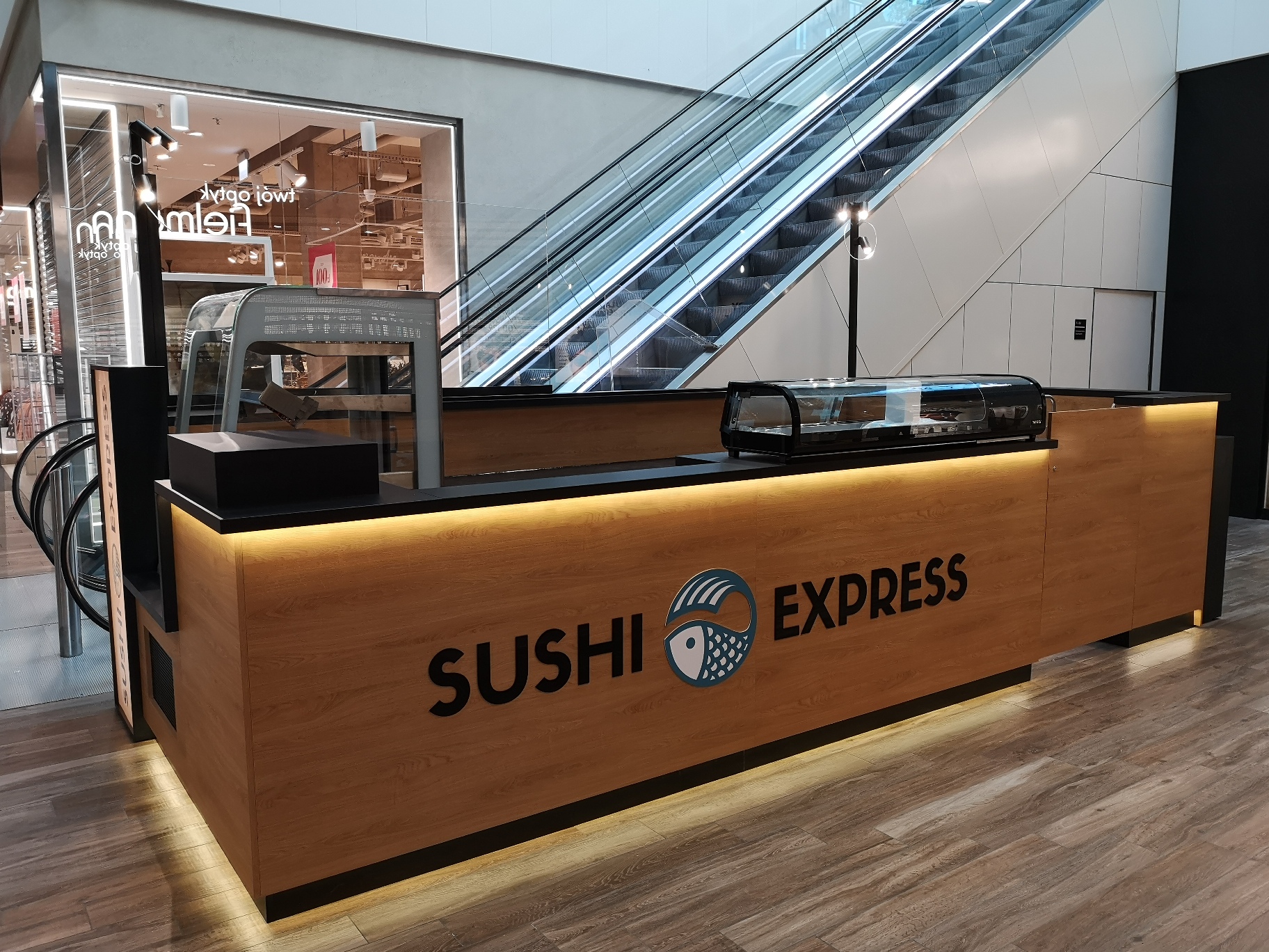 Nasze najnowsze wyzwanie to stoisko gastronomiczne dla marki Sushi Express w Galerii Handlowej Forum Gdańsk. Wąska przestrzeń pomiędzy schodami ruchomymi a korporacyjnym sklepem stworzyła jednocześnie wyjątkowe i wymagające warunki, które z sukcesem spełniliśmy, tworząc efektywną strefę produkcji i sprzedaży.
