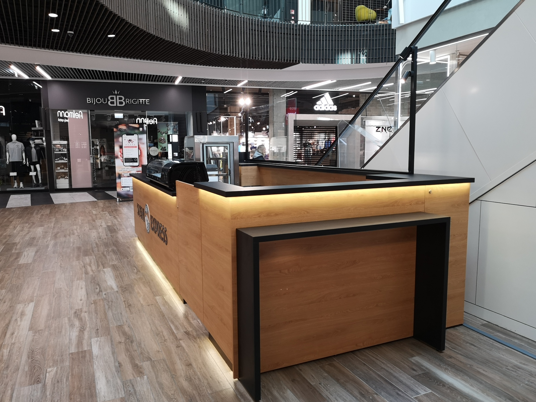 Stoisko, o powierzchni 250 x 550 cm, zostało zaprojektowane w minimalistycznym stylu, z wykorzystaniem laminatów i laminatów HPL w ciepłych odcieniach drewna i głębokiej czerni. Estetyka stoiska doskonale współgra z ekskluzywnym otoczeniem Galerii Handlowej.