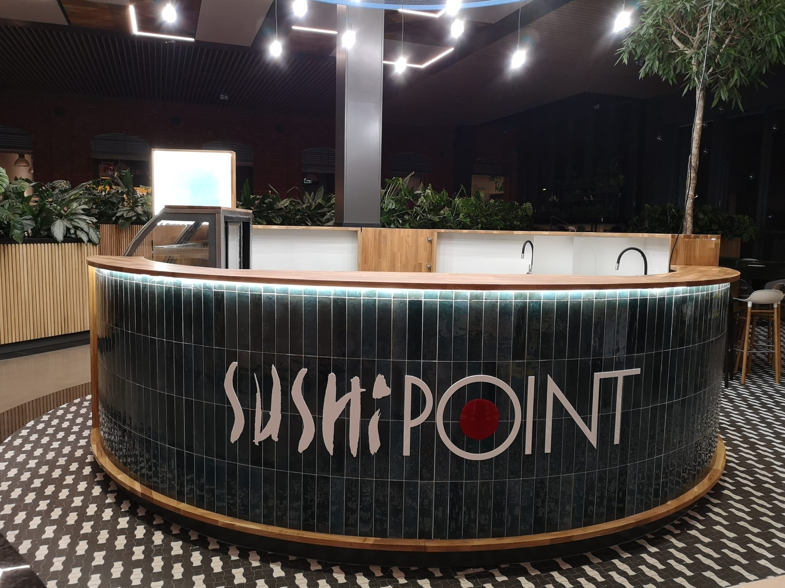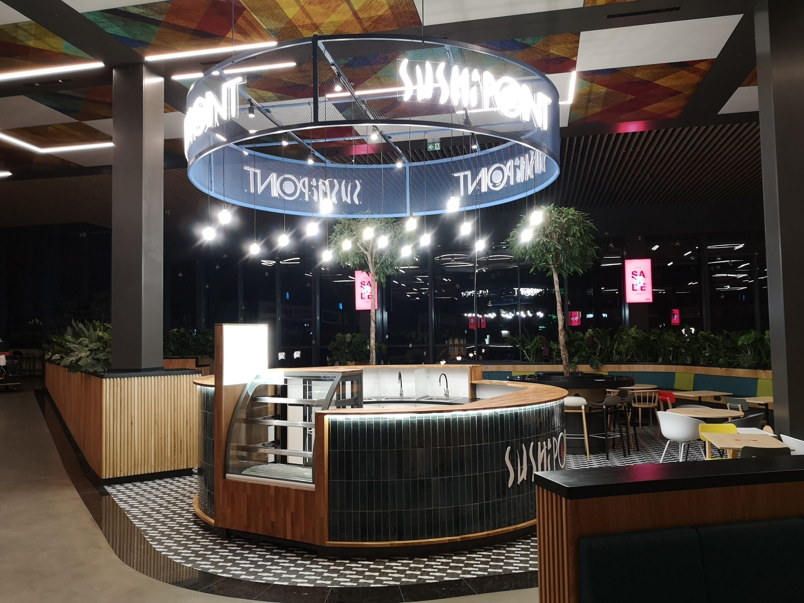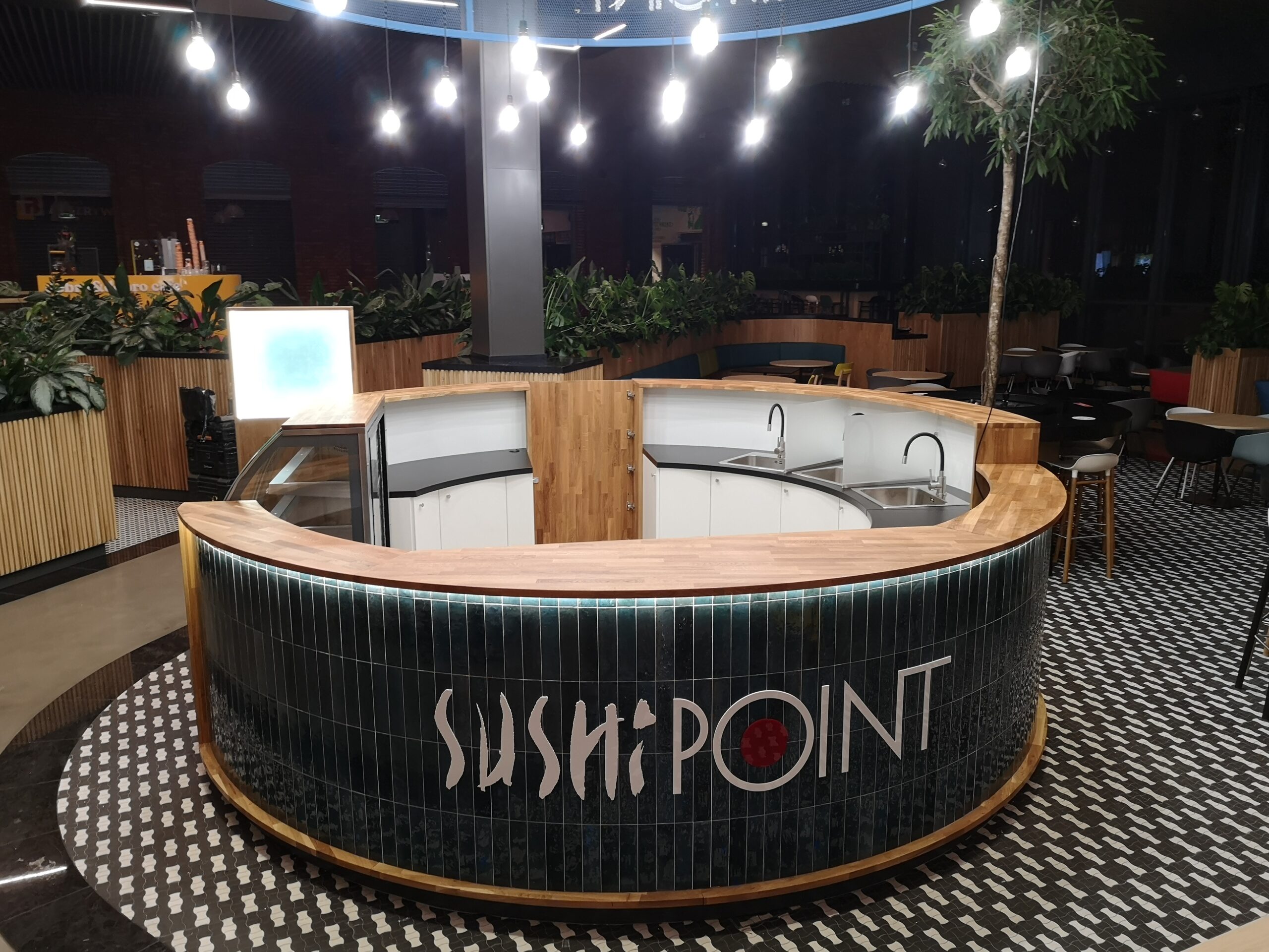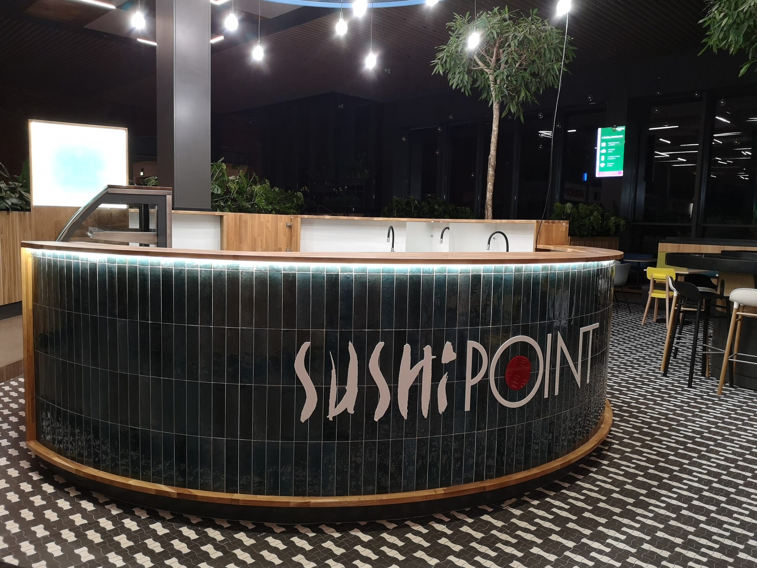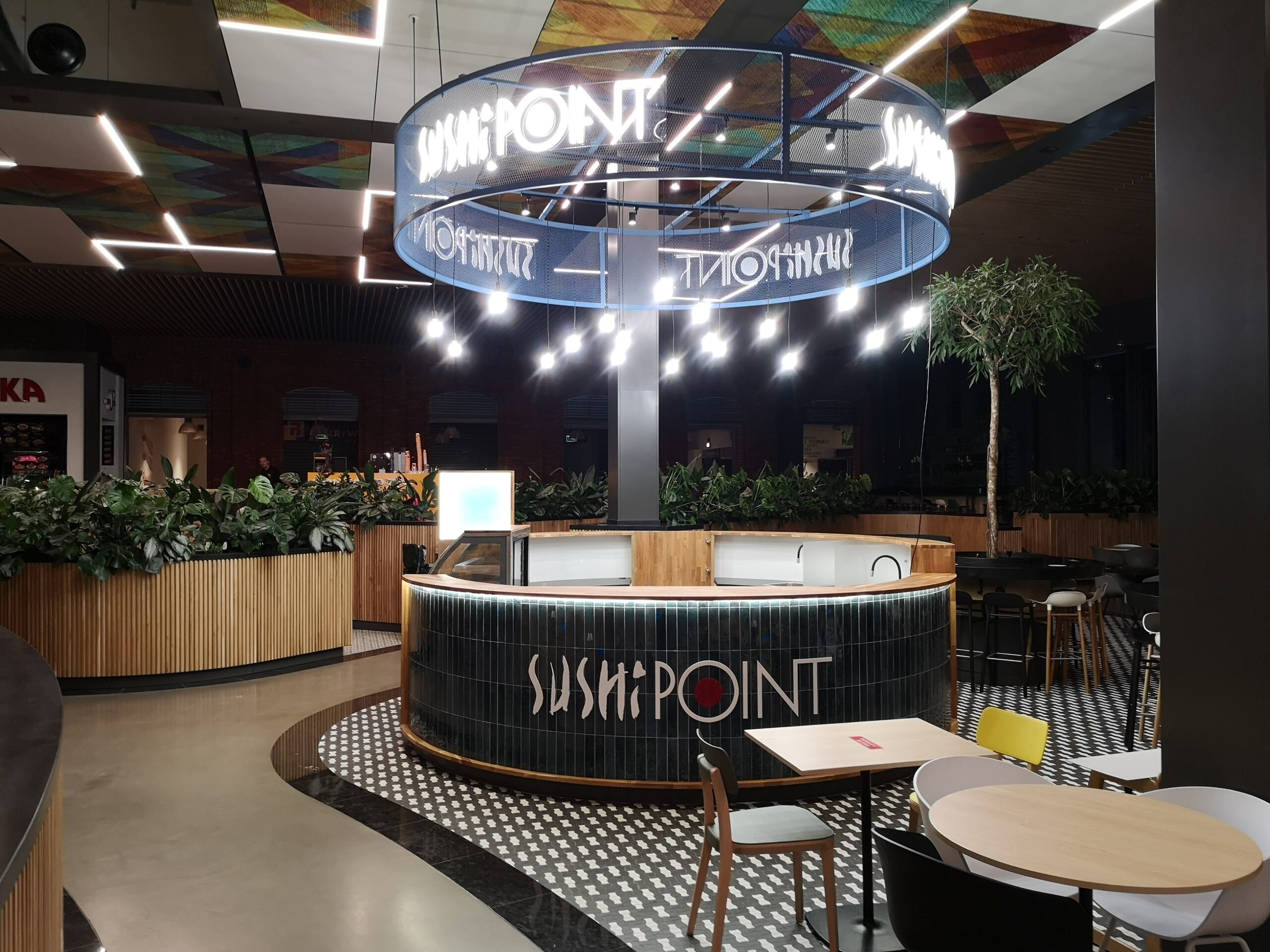 Nad stoiskiem góruje konstrukcja stalowa, na której zamocowano logo z liter kasetonowych oraz oświetlenie główne i dekoracyjne w postaci żarówek typu edison. Dzięki temu stoisko Sushi Point wyróżnia się wśród innych punktów gastronomicznych w centrum handlowym i przyciąga uwagę klientów.
