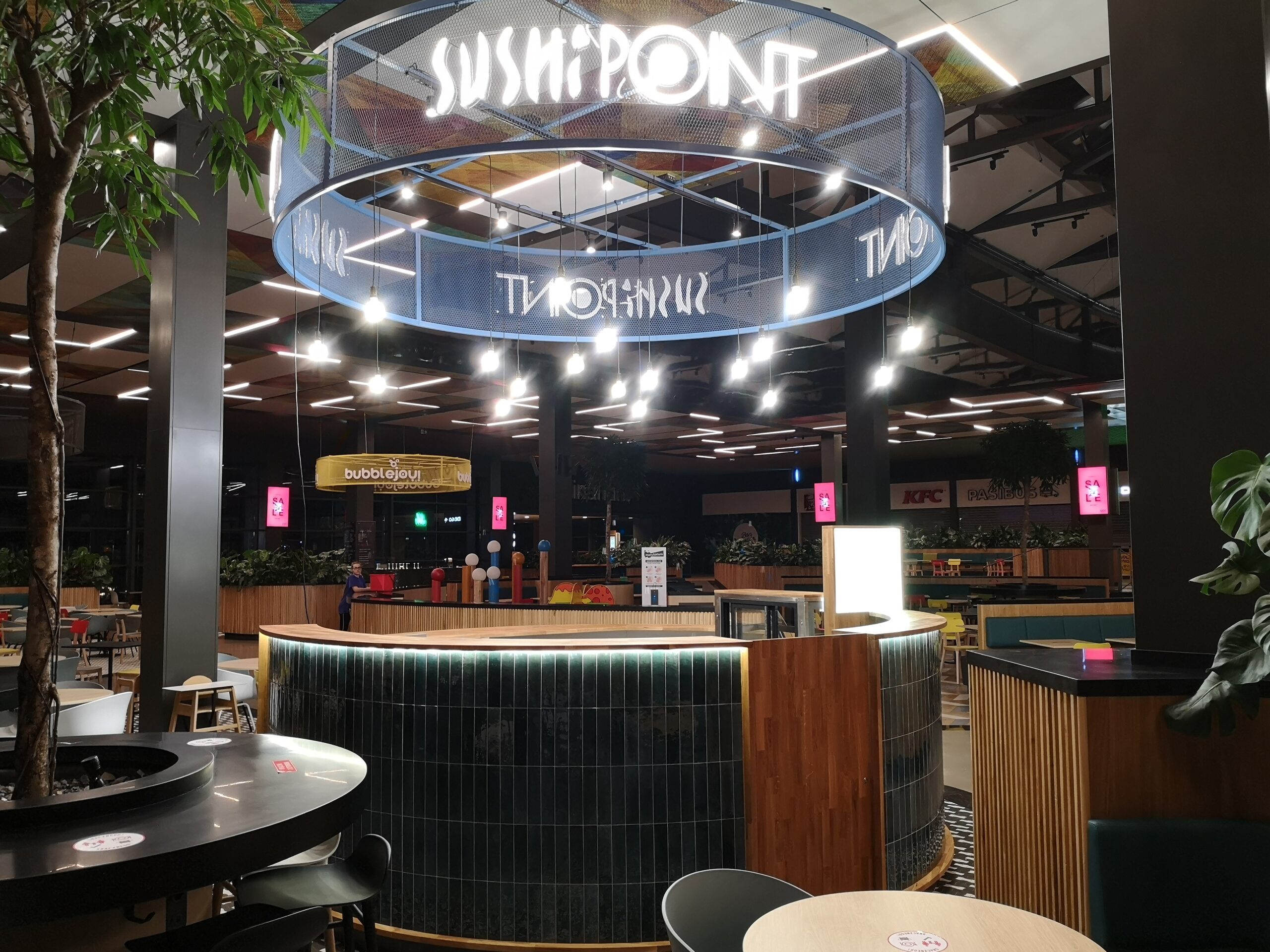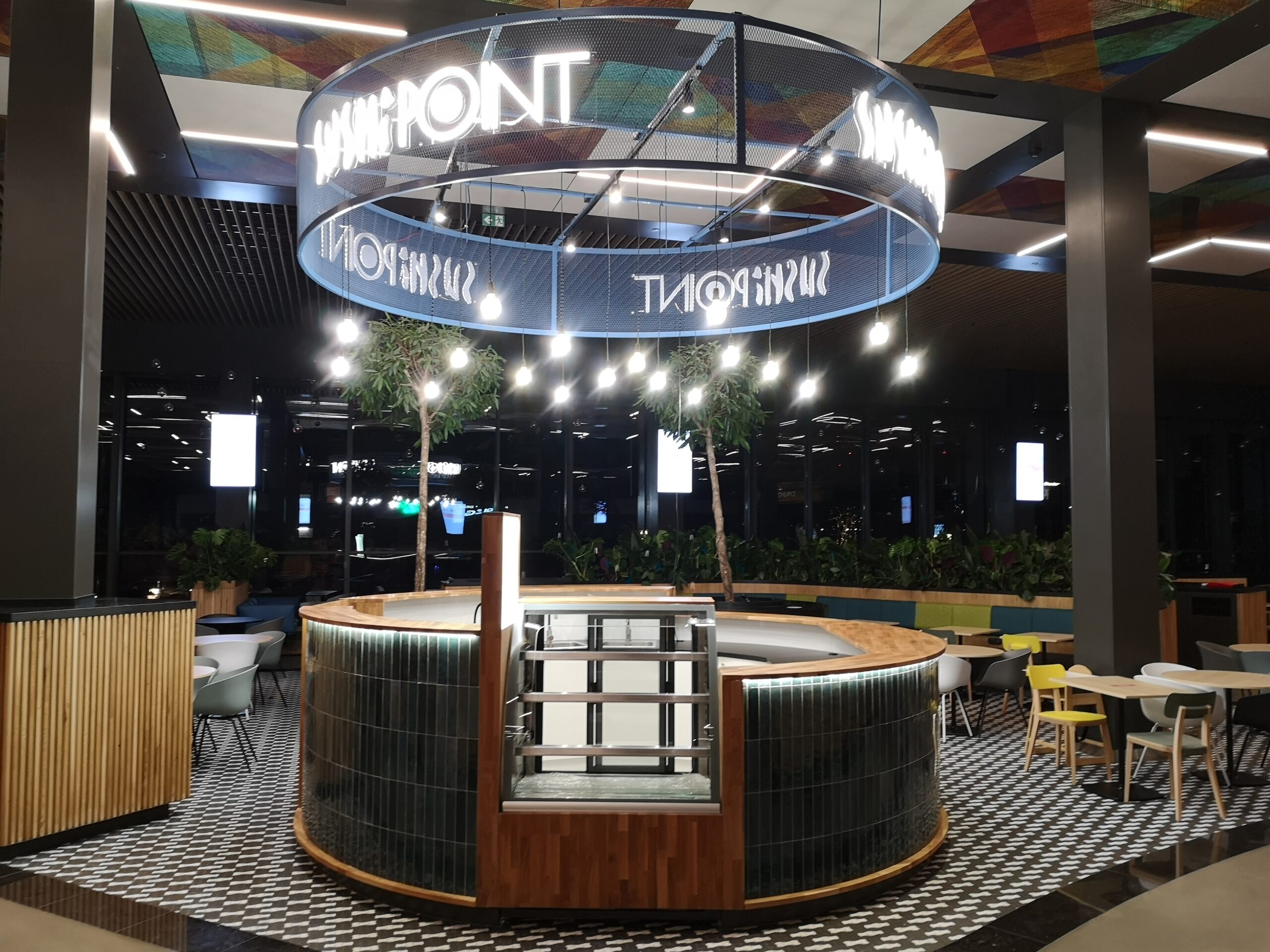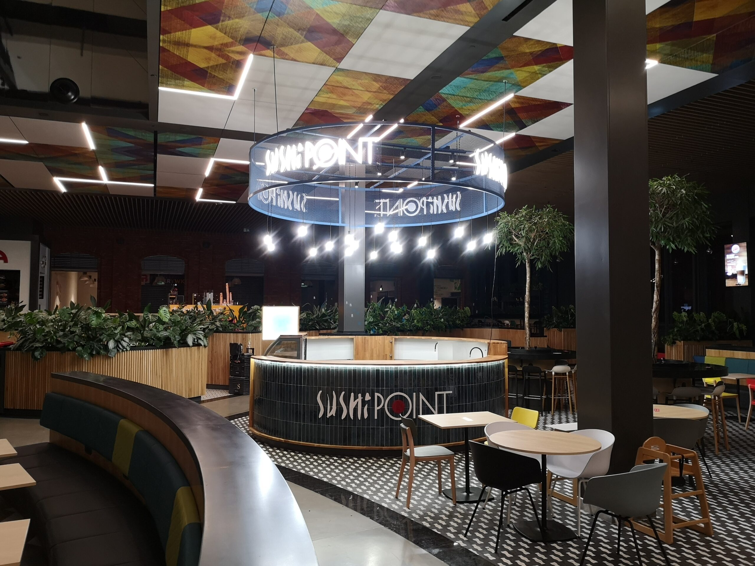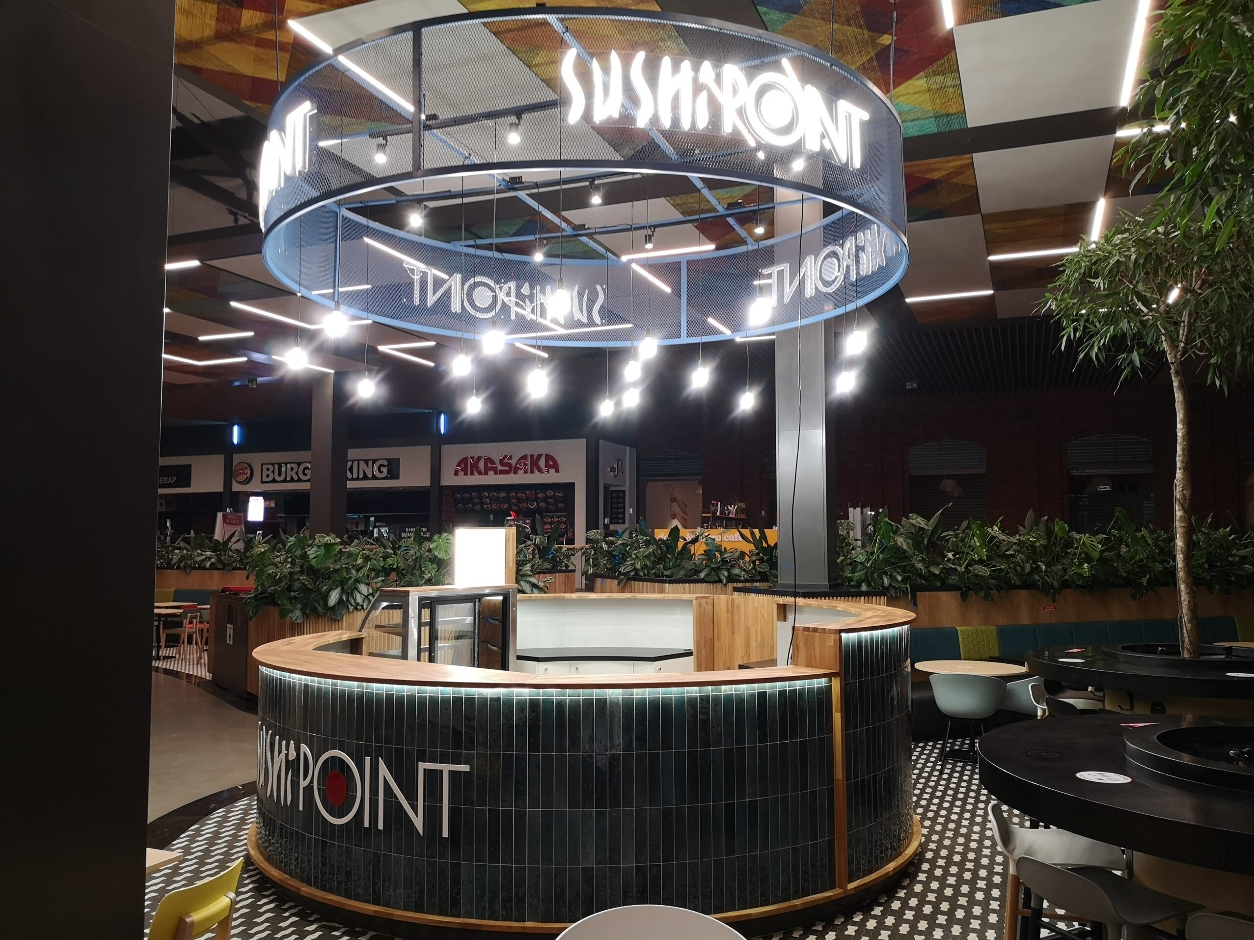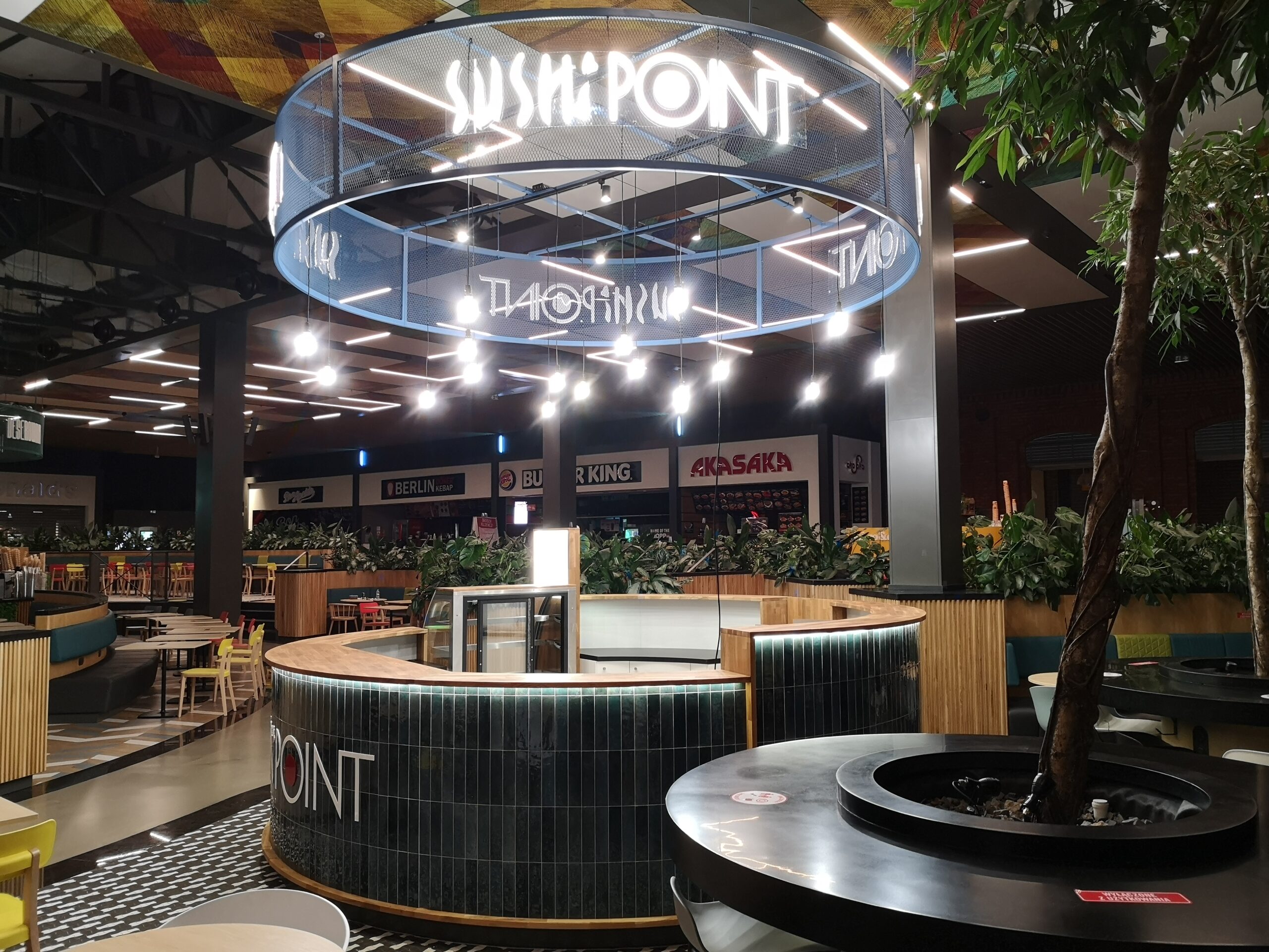Nad stoiskiem góruje konstrukcja stalowa, na której zamocowano logo z liter kasetonowych oraz oświetlenie główne i dekoracyjne w postaci żarówek typu edison. Dzięki temu stoisko Sushi Point wyróżnia się wśród innych punktów gastronomicznych w centrum handlowym i przyciąga uwagę klientów.