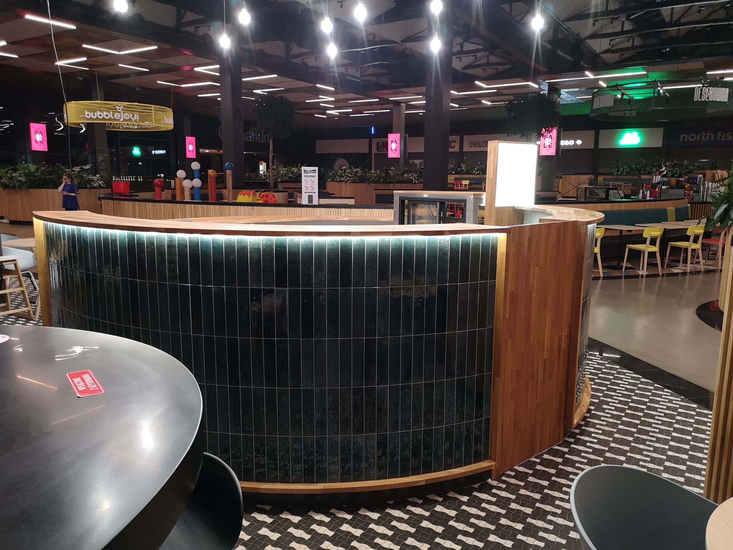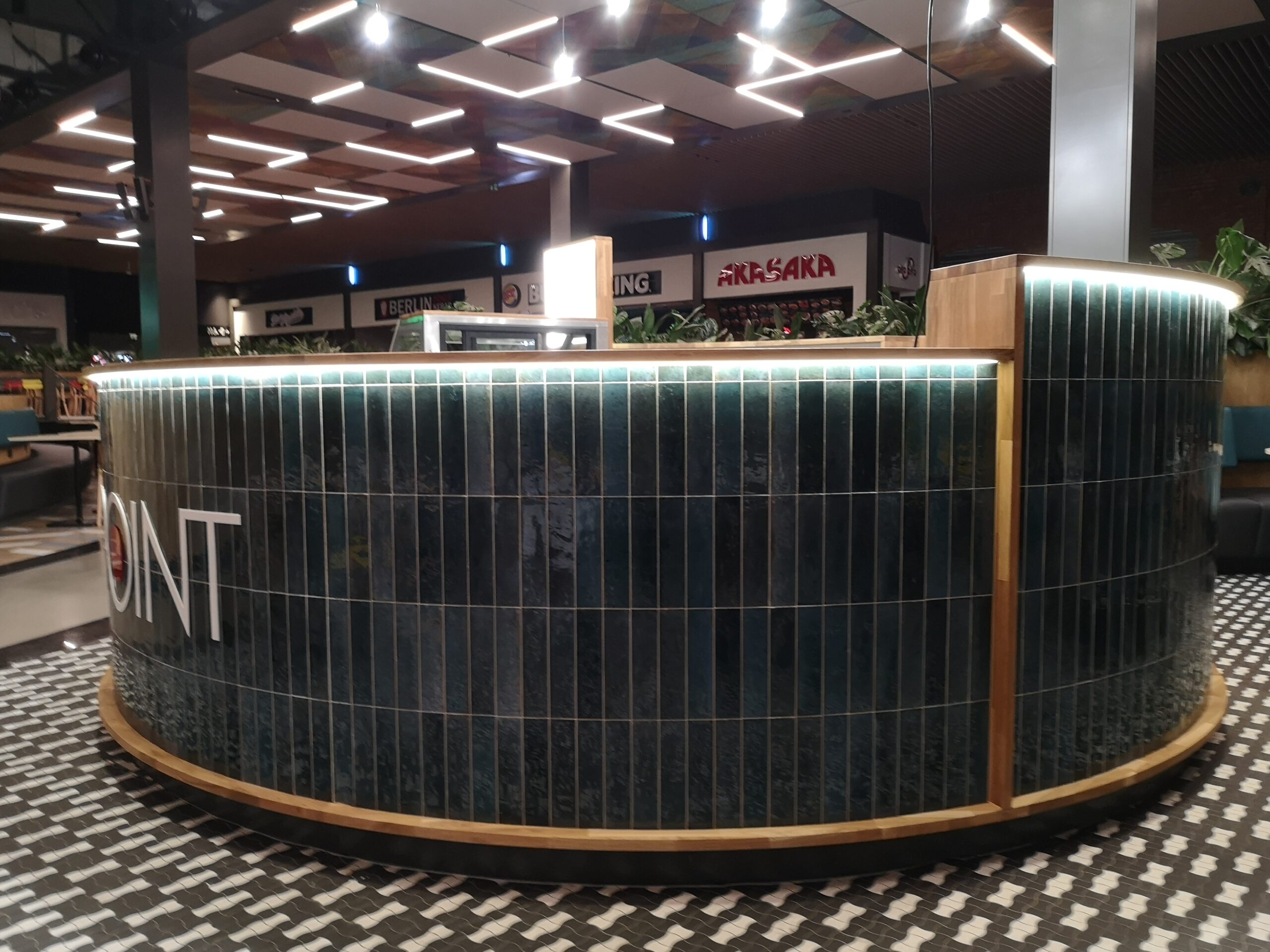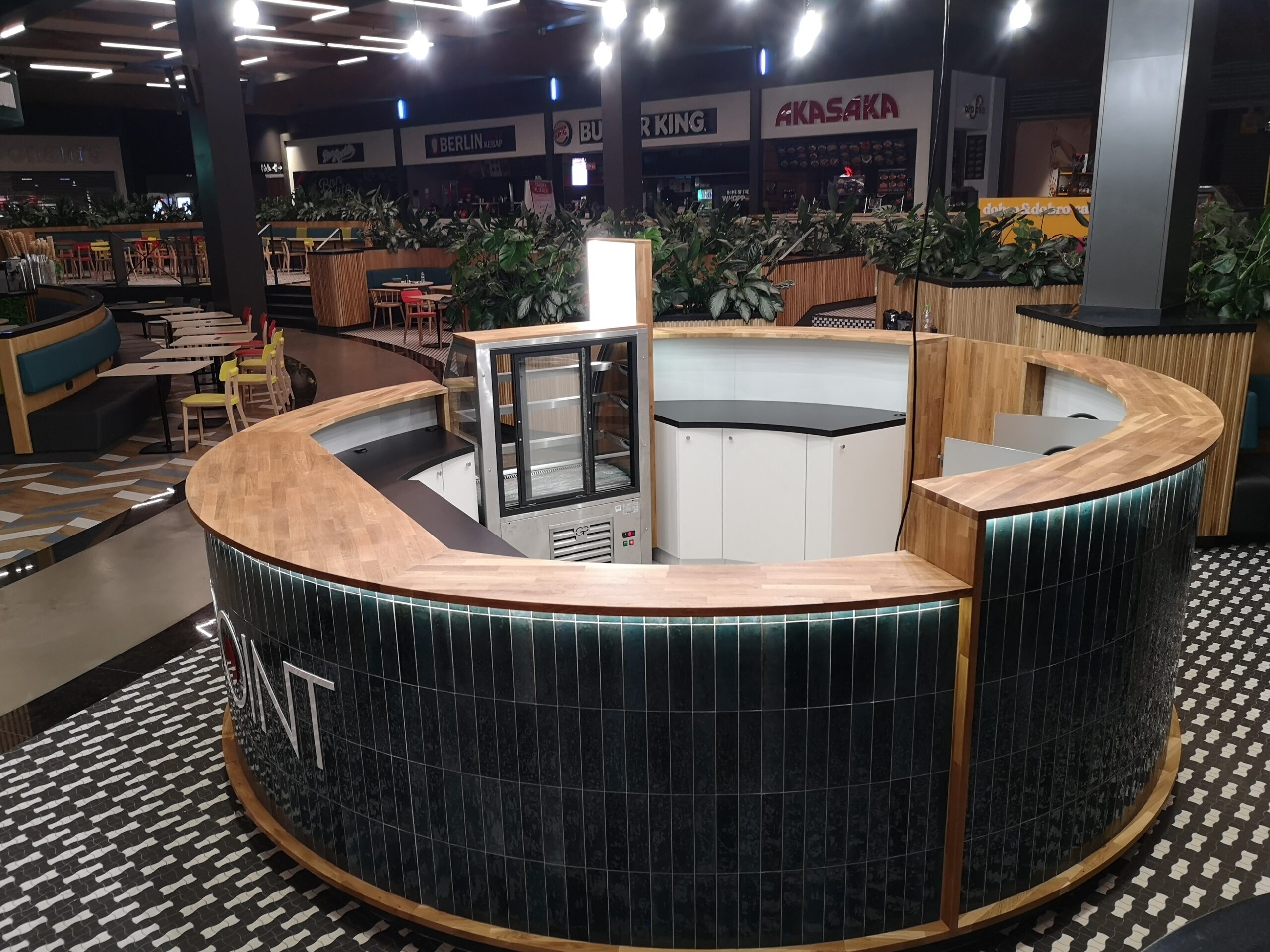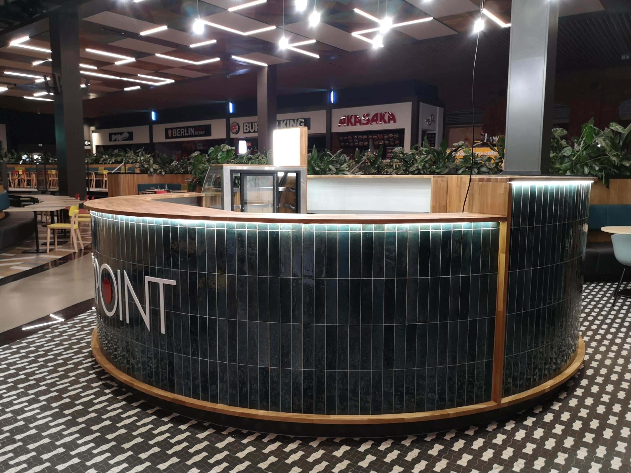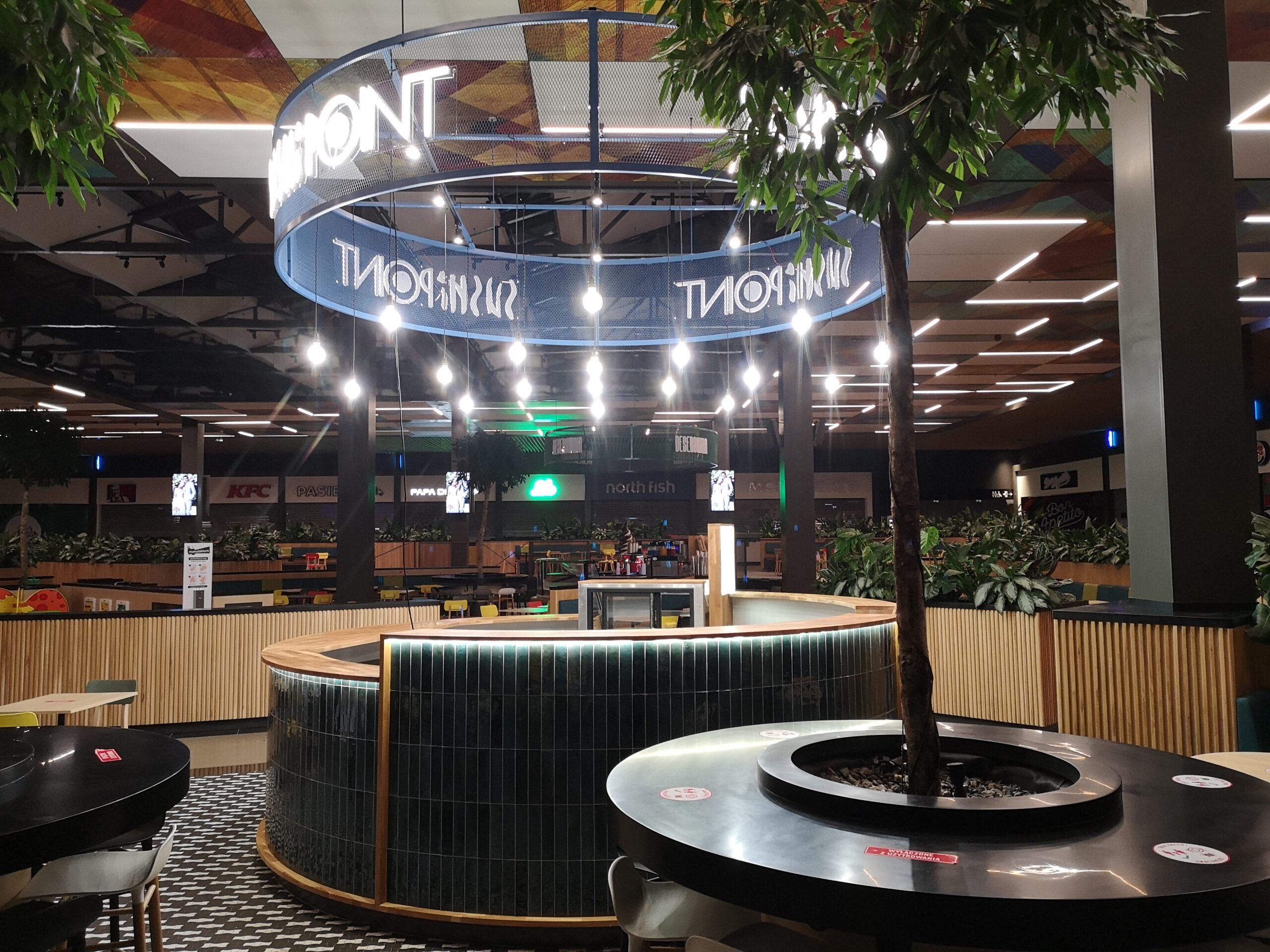 Nad stoiskiem góruje konstrukcja stalowa, na której zamocowano logo z liter kasetonowych oraz oświetlenie główne i dekoracyjne w postaci żarówek typu edison. Dzięki temu stoisko Sushi Point wyróżnia się wśród innych punktów gastronomicznych w centrum handlowym i przyciąga uwagę klientów.