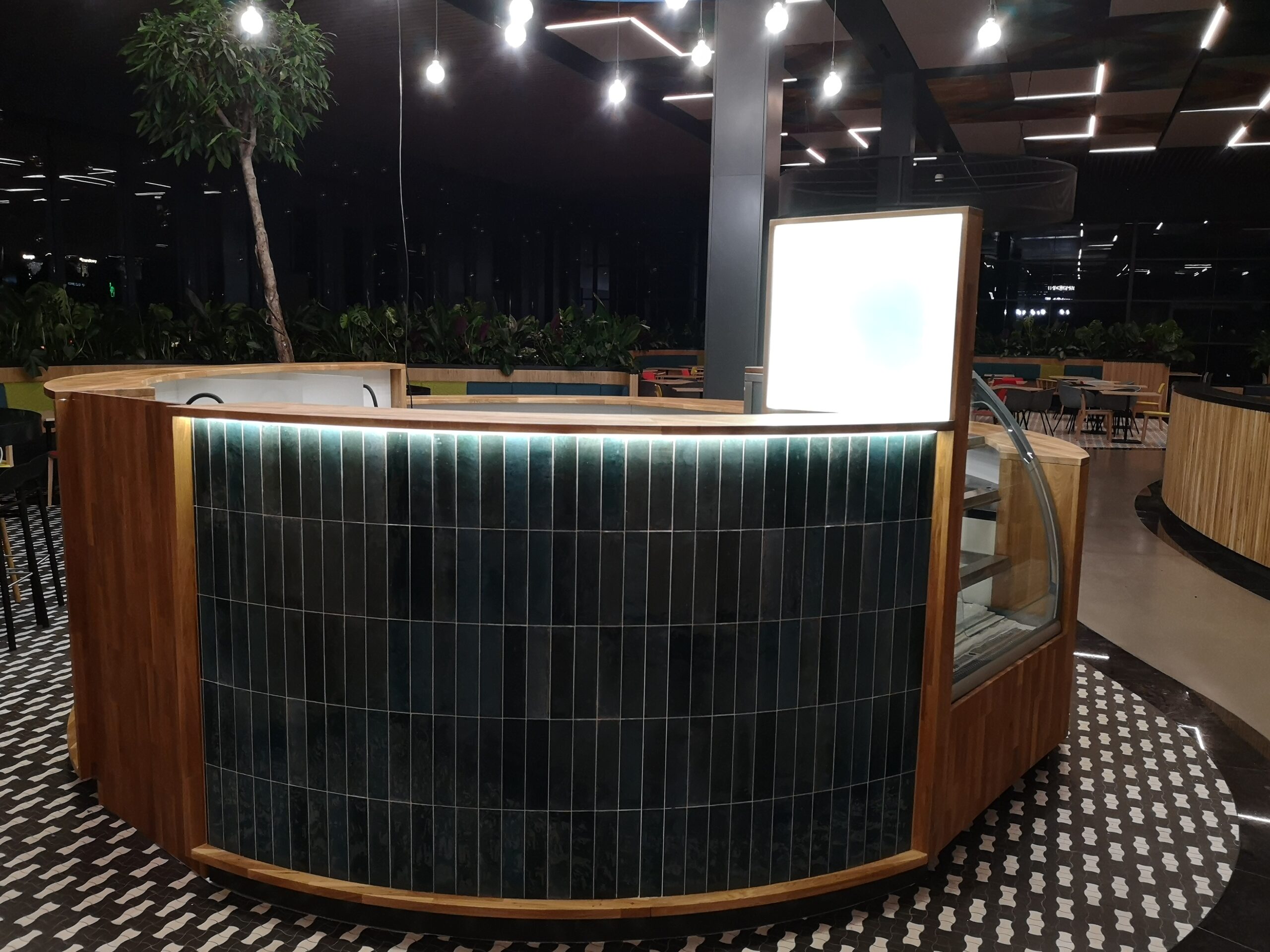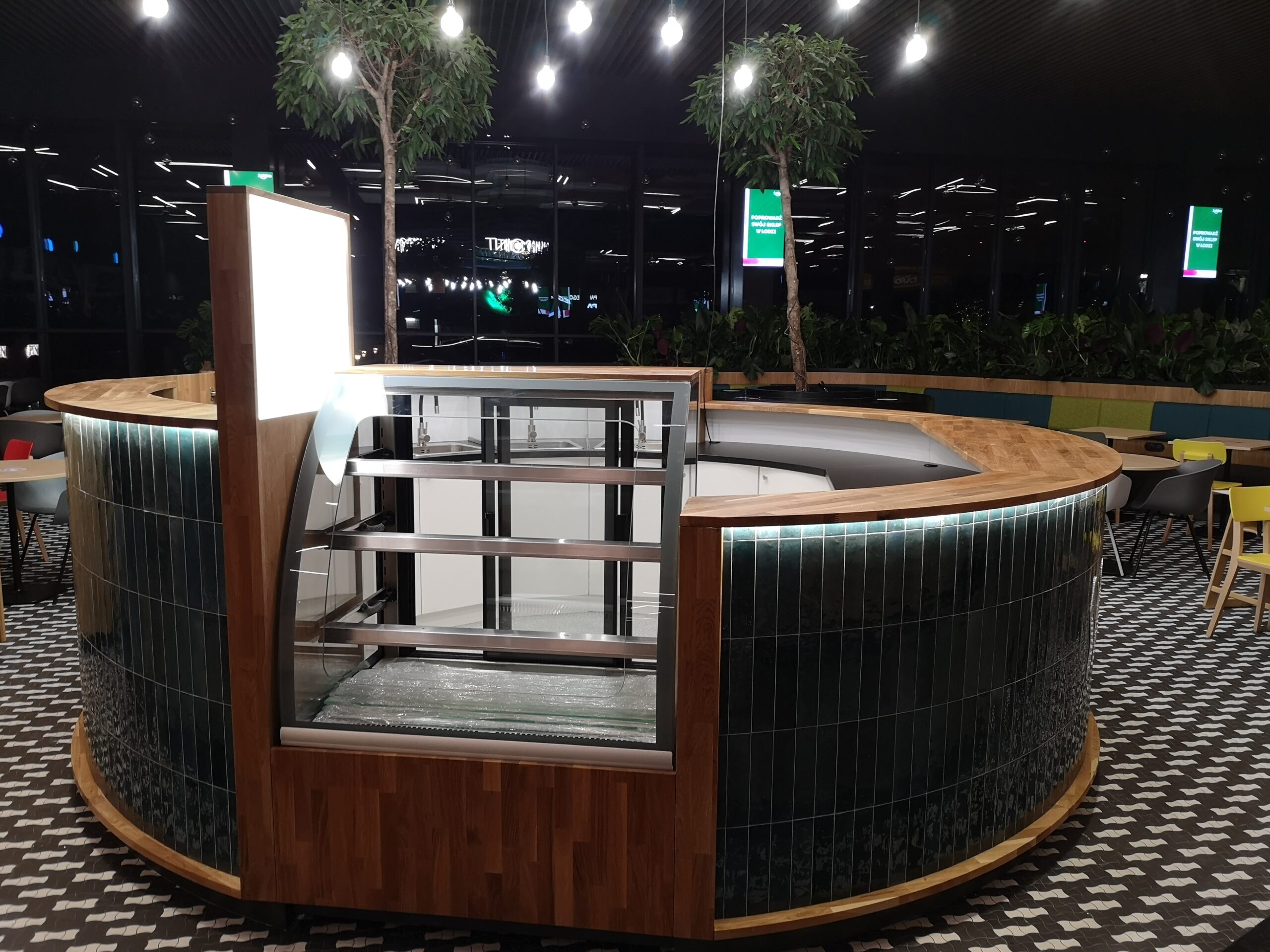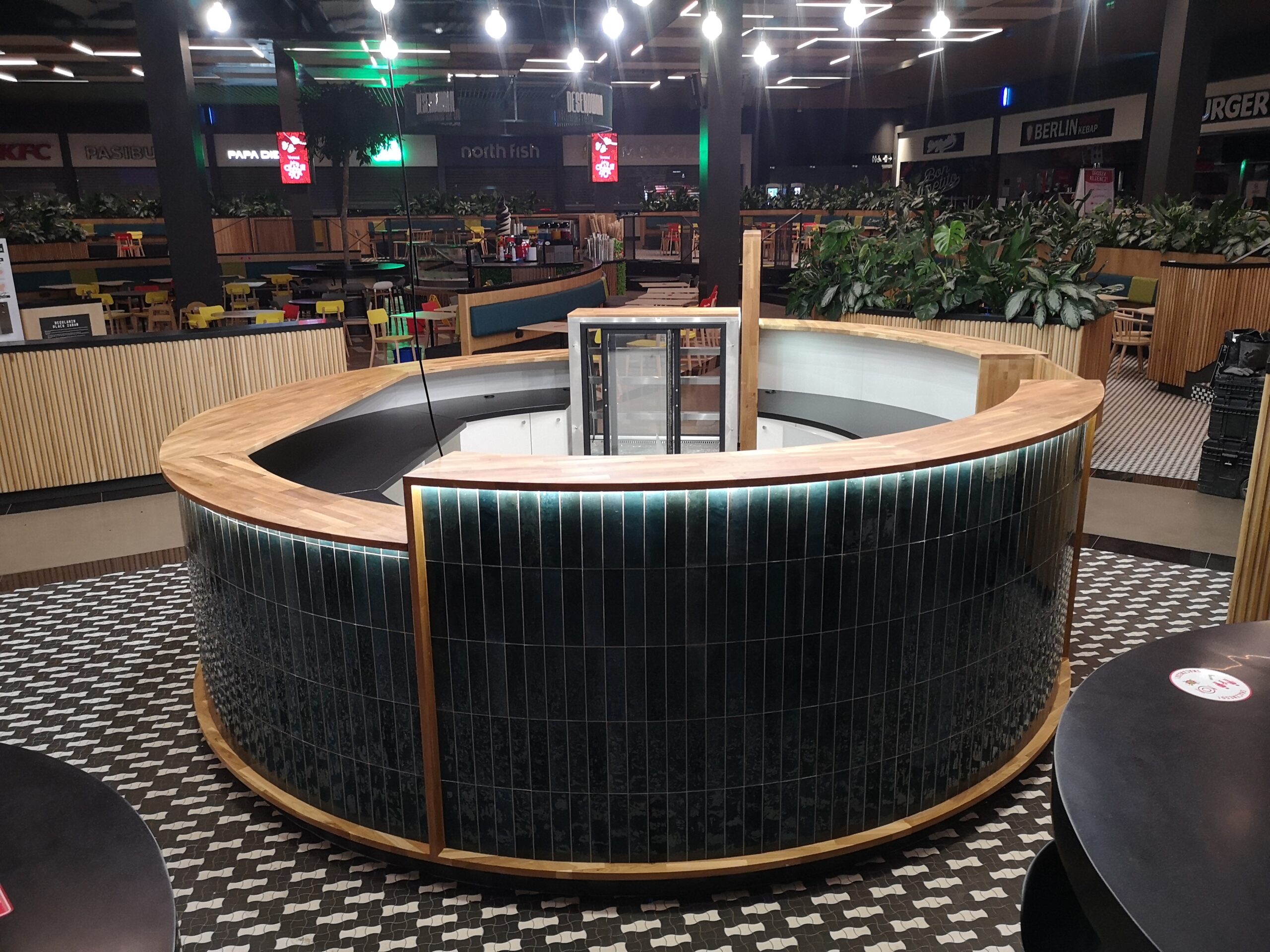 Wewnątrz stoiska przewidziano zabudowę stolarską, która zapewnia wygodne i funkcjonalne warunki pracy. Zaprojektowana technologia magazynowania, mycia, przygotowania, pakowania i sprzedaży pozwala na sprawną i szybką obsługę klientów. Blaty robocze na wysokości 90 cm, pod którymi przewidziano lodówki i podłączenia elektryczne do sprzętów nablatowych, pozwalają na łatwe i szybkie przygotowywanie dań.