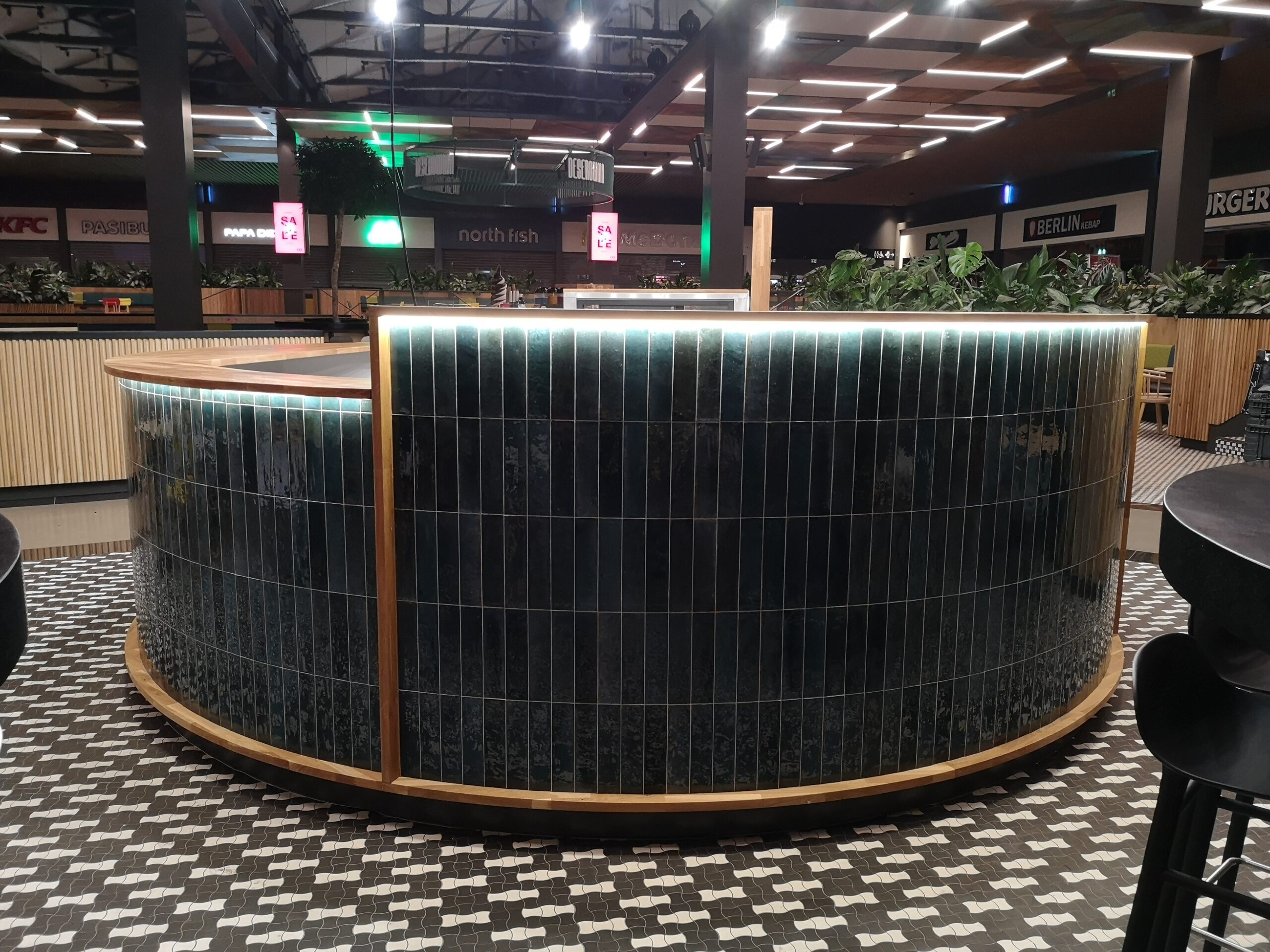 Stoisko zostało umieszczone na planie koła o średnicy 4 metrów, co sprawia, że z daleka przyciąga uwagę klientów centrum handlowego. Zastosowana technologia stolarska z płyt laminowanych drewnopodobnych i czarnych daje stoisku elegancki i nowoczesny wygląd. Obudowa stoiska została wykonana z naturalnego drewna dębowego oraz włoskich płytek w kolorach morza, a dookoła umieszczono logo i grafiki z pleksi barwionej w masie, co dodaje stoisku niepowtarzalnego charakteru.