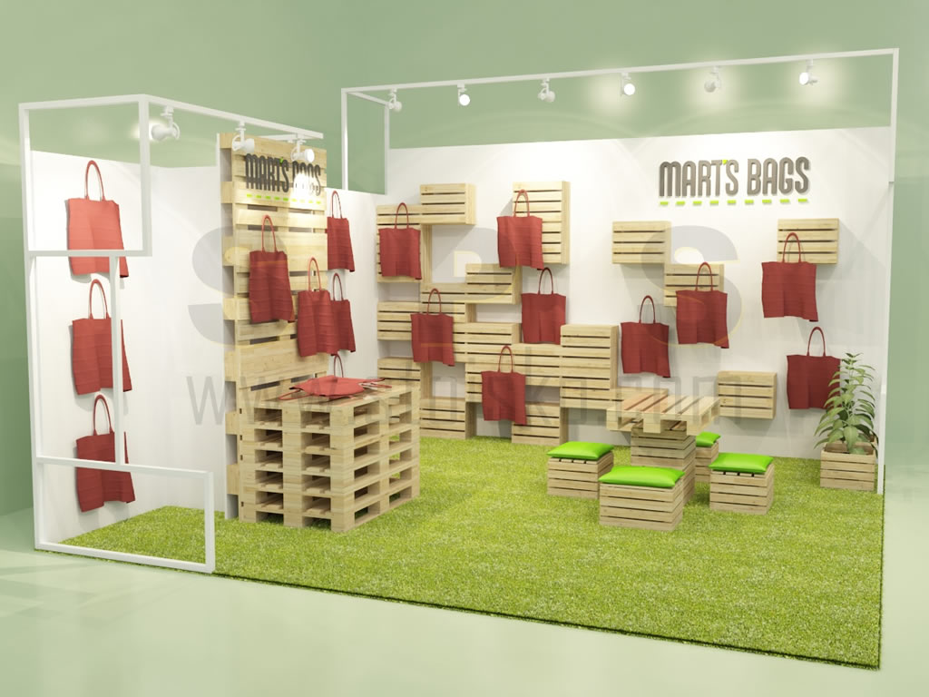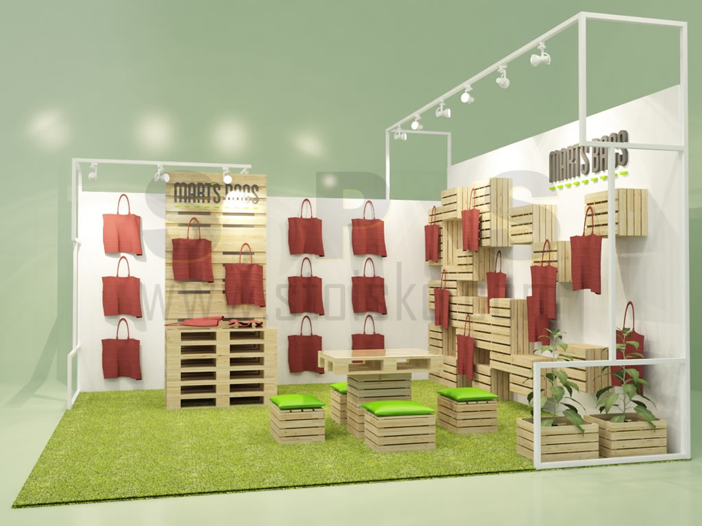Stoisko na ramach stalowych z elementami zieleni i drewna.