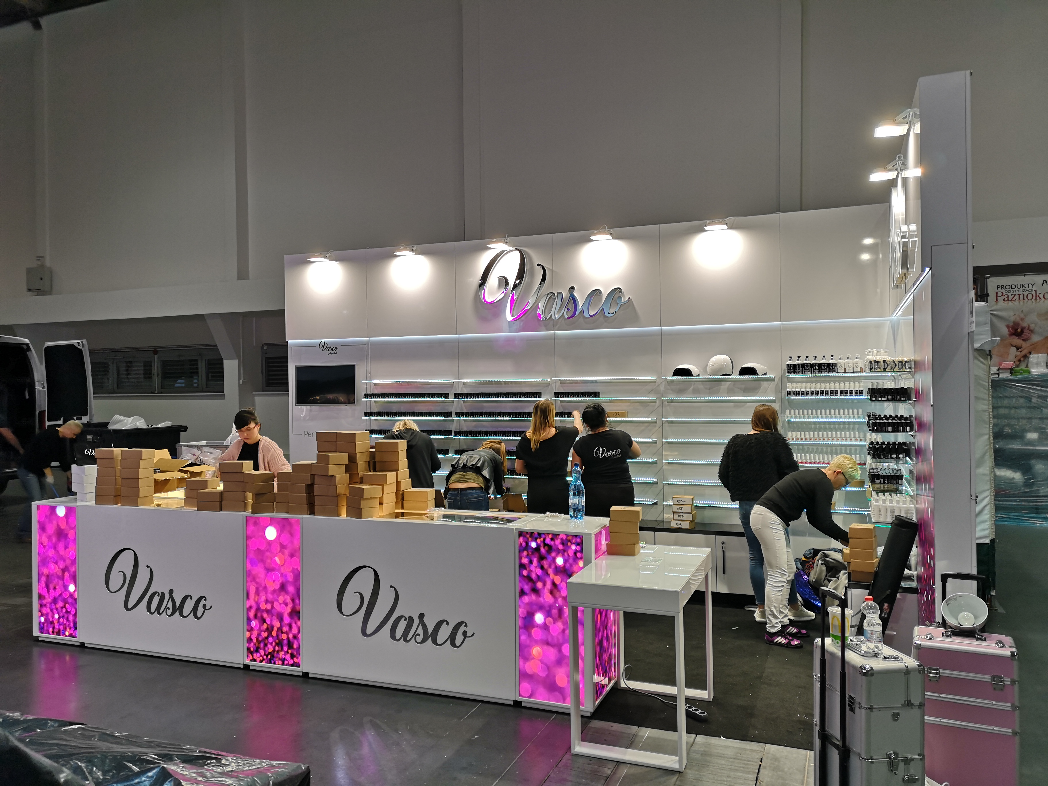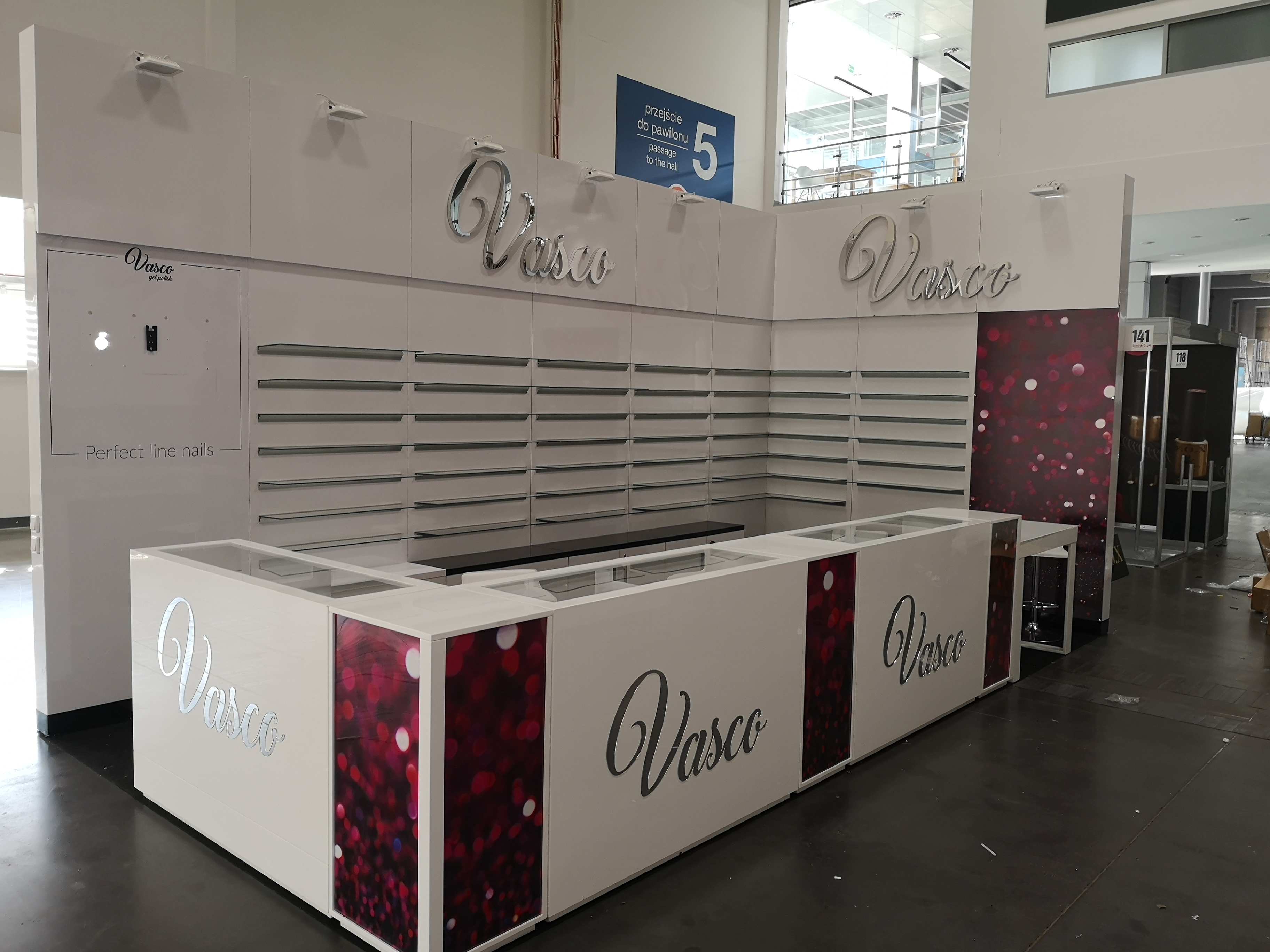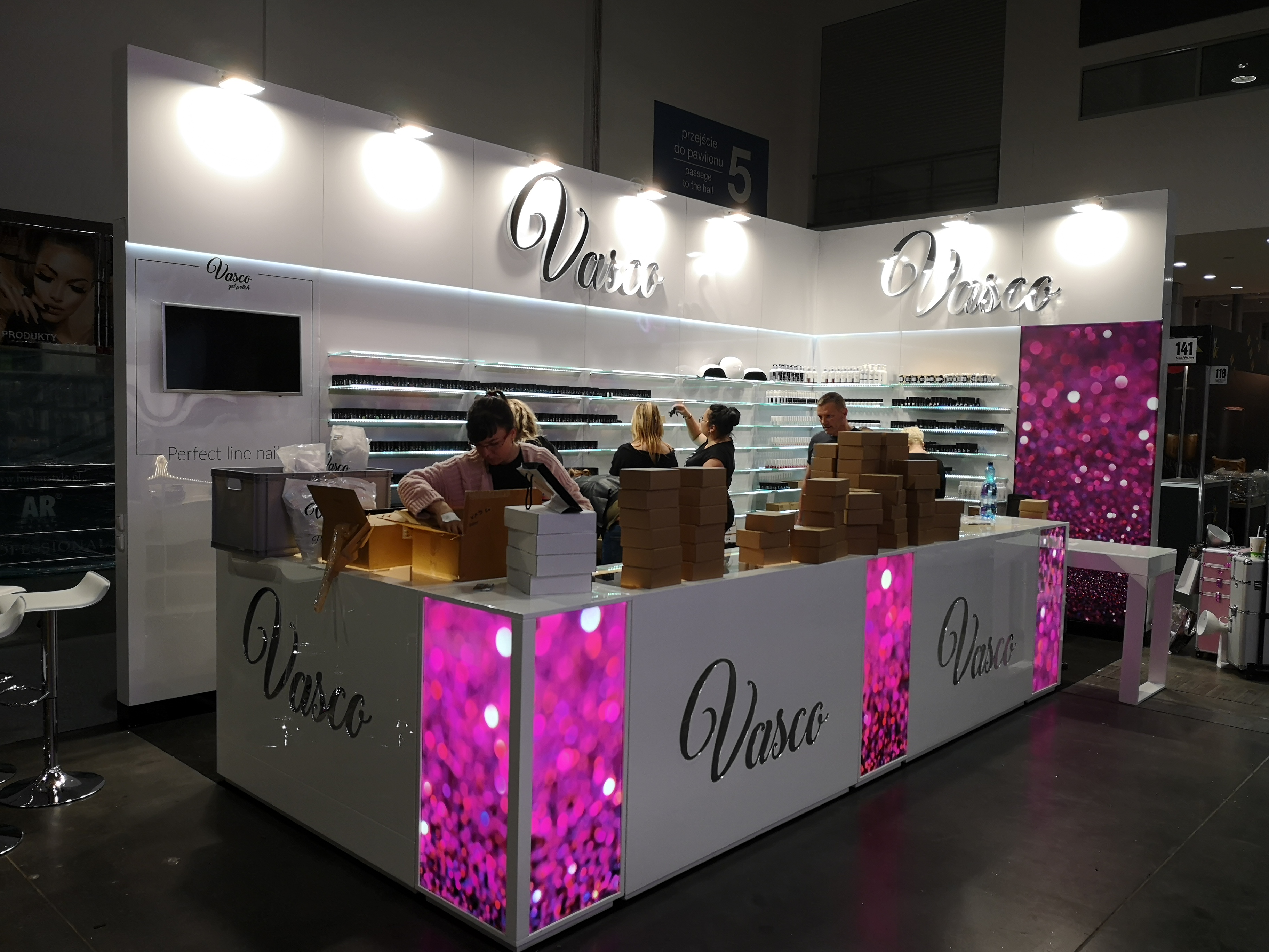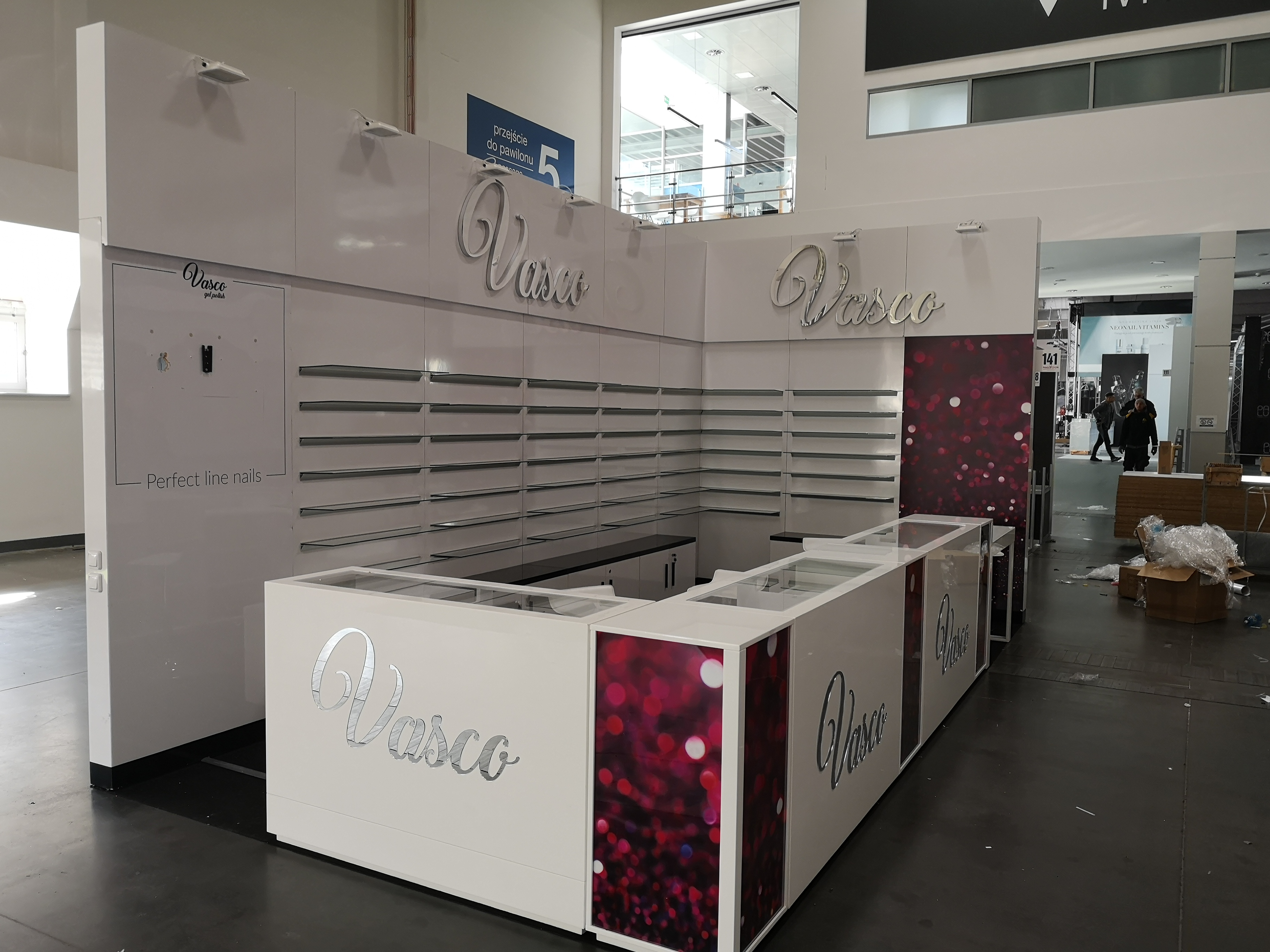 Na targach Beauty Vision 2019 edycja wiosenna wykonaliśmy powiększone i odświeżone stoisko dla Vasco Cosmetics. Zabudowa targowa miała powierzchnię 18 m2 (3 x 6 m obrysu). Stoisko posiadało nowe fronty lakierowane z grafikami podświetlanymi oraz dobraną pod nie wykładzinę wysokiej jakości w kolorze czarnym. Na nadstawce pojawiły się nowe loga lustrzane 3D nawiązujące do lustrzanych logotypów na ladach. Tylna ściana posiadała półki szklane z podświetleniami LED oraz dodatkowe doświetlenia LED z nadstawek. Pod półkami wykonano szafki i szuflady do magazynowania towaru. Mimo, że stoisko było wyspowe, dla lepszego wykorzystania przestrzeni wykonano ścianę narożna z półkami i podświetlanym kasetonem. Z drugiej strony zabudowy, przy pasażu, pojawiła się ścianka w połysku z dużym logiem do robienia zdjęć. Mamy nadzieję, że na kolejnej imprezie stoisko będzie jeszcze większe, z nowymi intrygującymi elementami.