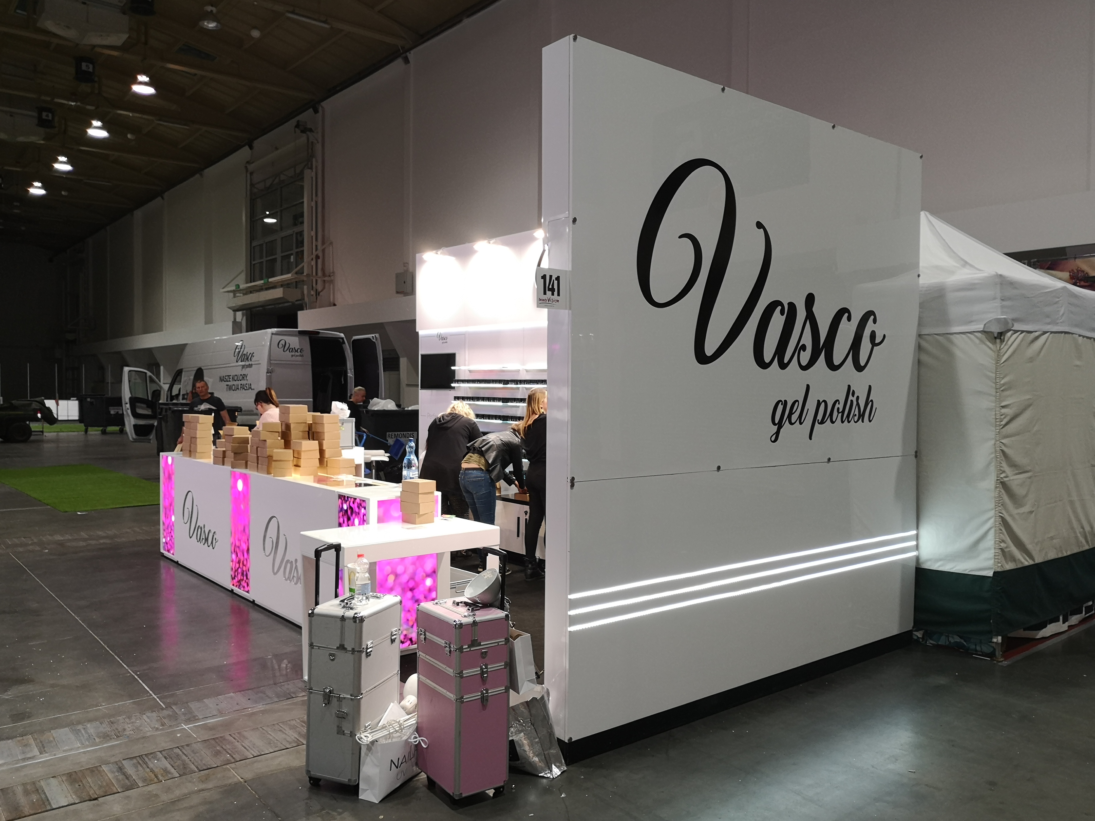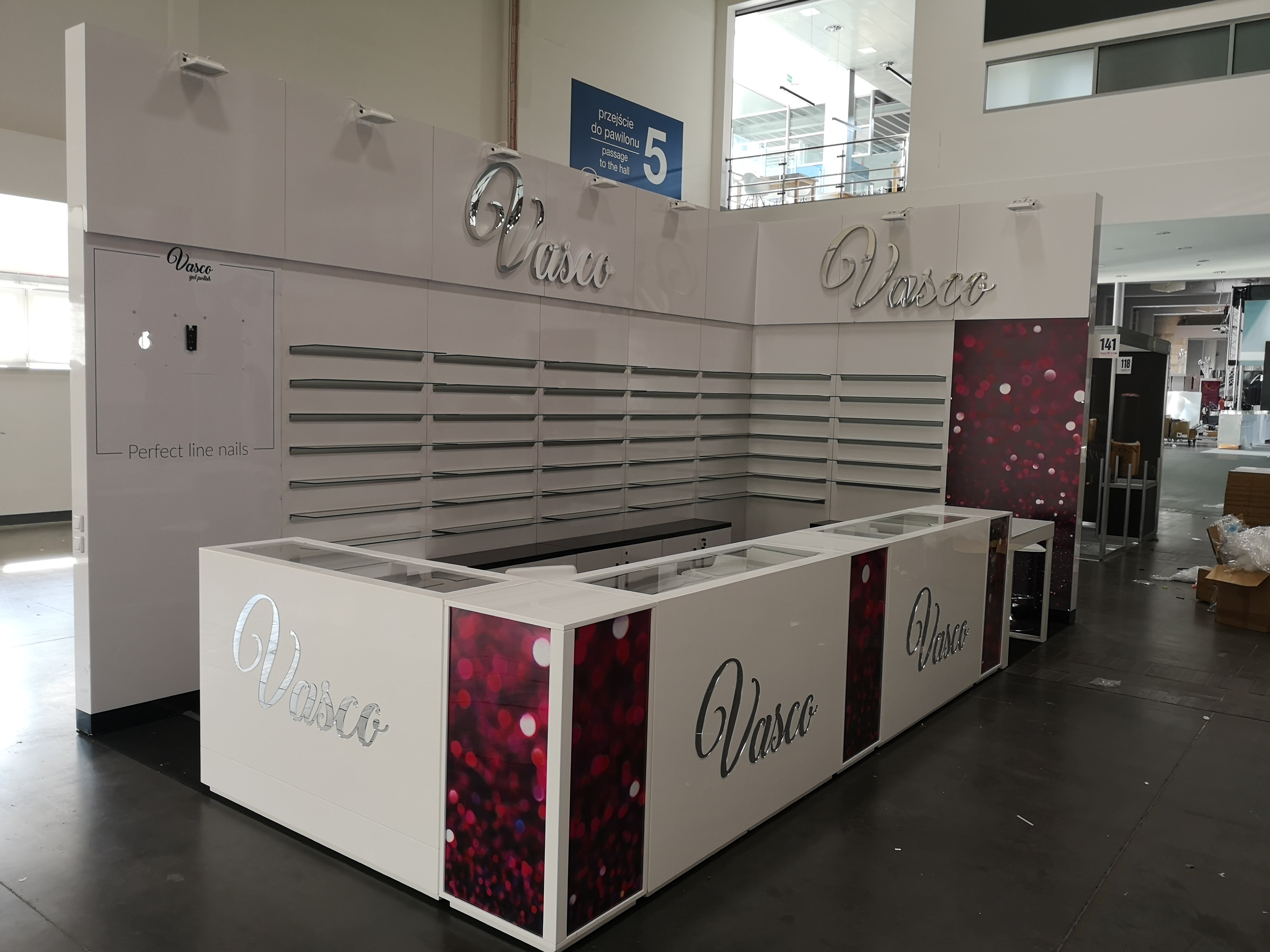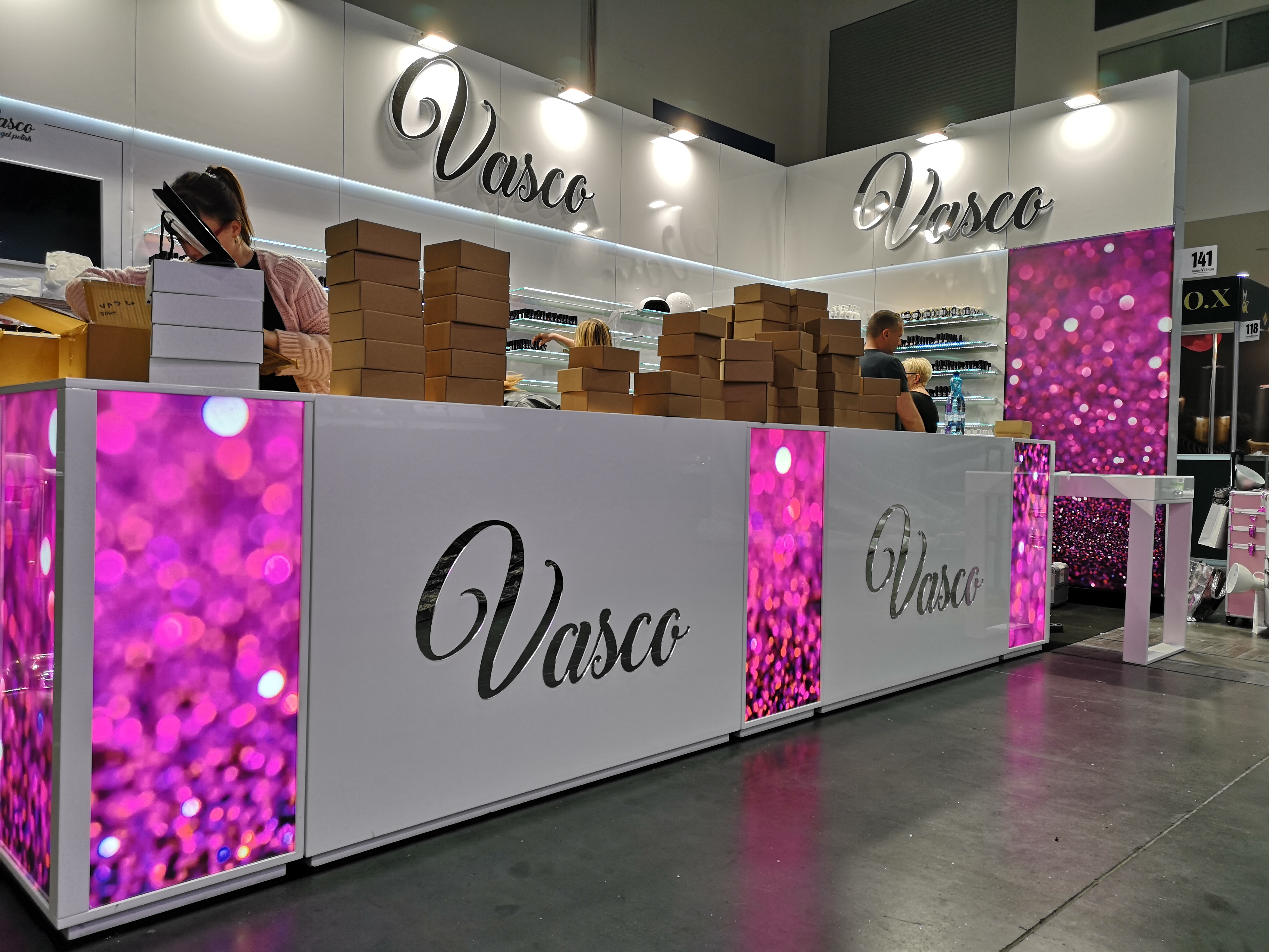 Na targach Beauty Vision 2019 edycja wiosenna wykonaliśmy powiększone i odświeżone stoisko dla Vasco Cosmetics. Zabudowa targowa miała powierzchnię 18 m2 (3 x 6 m obrysu). Stoisko posiadało nowe fronty lakierowane z grafikami podświetlanymi oraz dobraną pod nie wykładzinę wysokiej jakości w kolorze czarnym. Na nadstawce pojawiły się nowe loga lustrzane 3D nawiązujące do lustrzanych logotypów na ladach. Tylna ściana posiadała półki szklane z podświetleniami LED oraz dodatkowe doświetlenia LED z nadstawek. Pod półkami wykonano szafki i szuflady do magazynowania towaru. Mimo, że stoisko było wyspowe, dla lepszego wykorzystania przestrzeni wykonano ścianę narożna z półkami i podświetlanym kasetonem. Z drugiej strony zabudowy, przy pasażu, pojawiła się ścianka w połysku z dużym logiem do robienia zdjęć. Mamy nadzieję, że na kolejnej imprezie stoisko będzie jeszcze większe, z nowymi intrygującymi elementami.