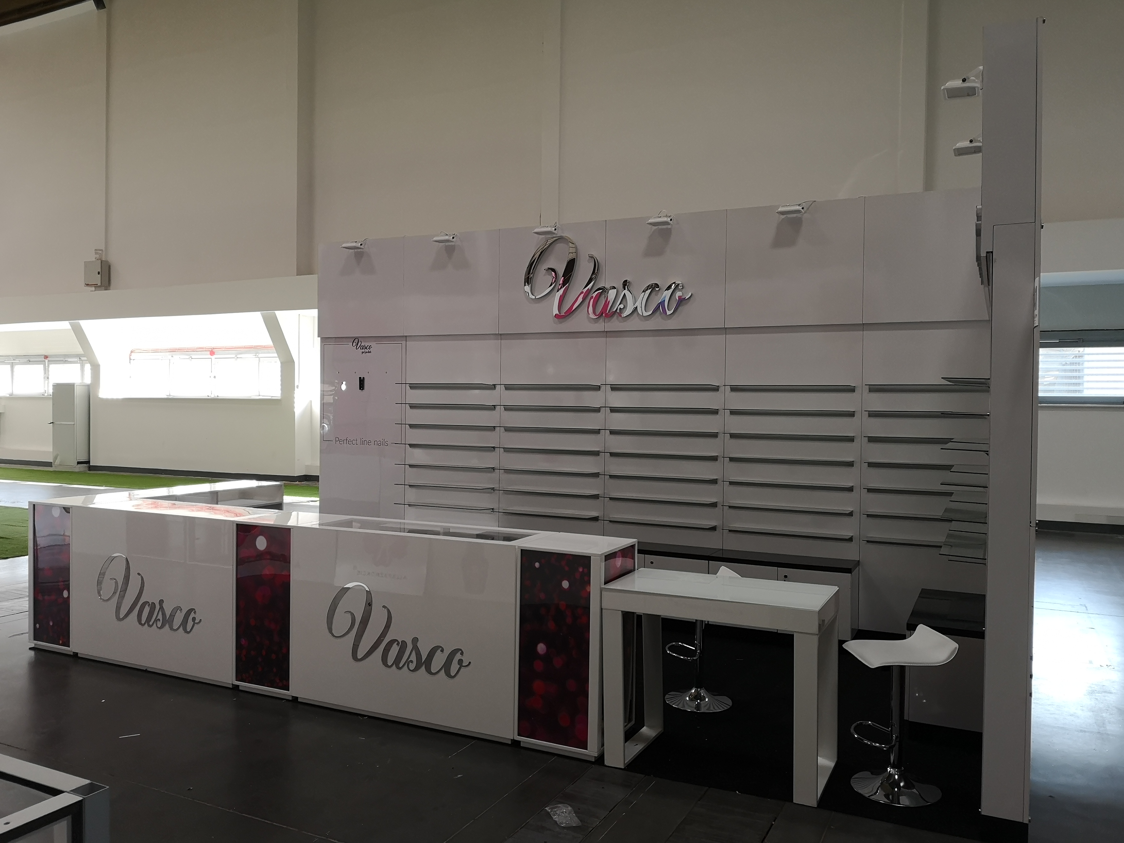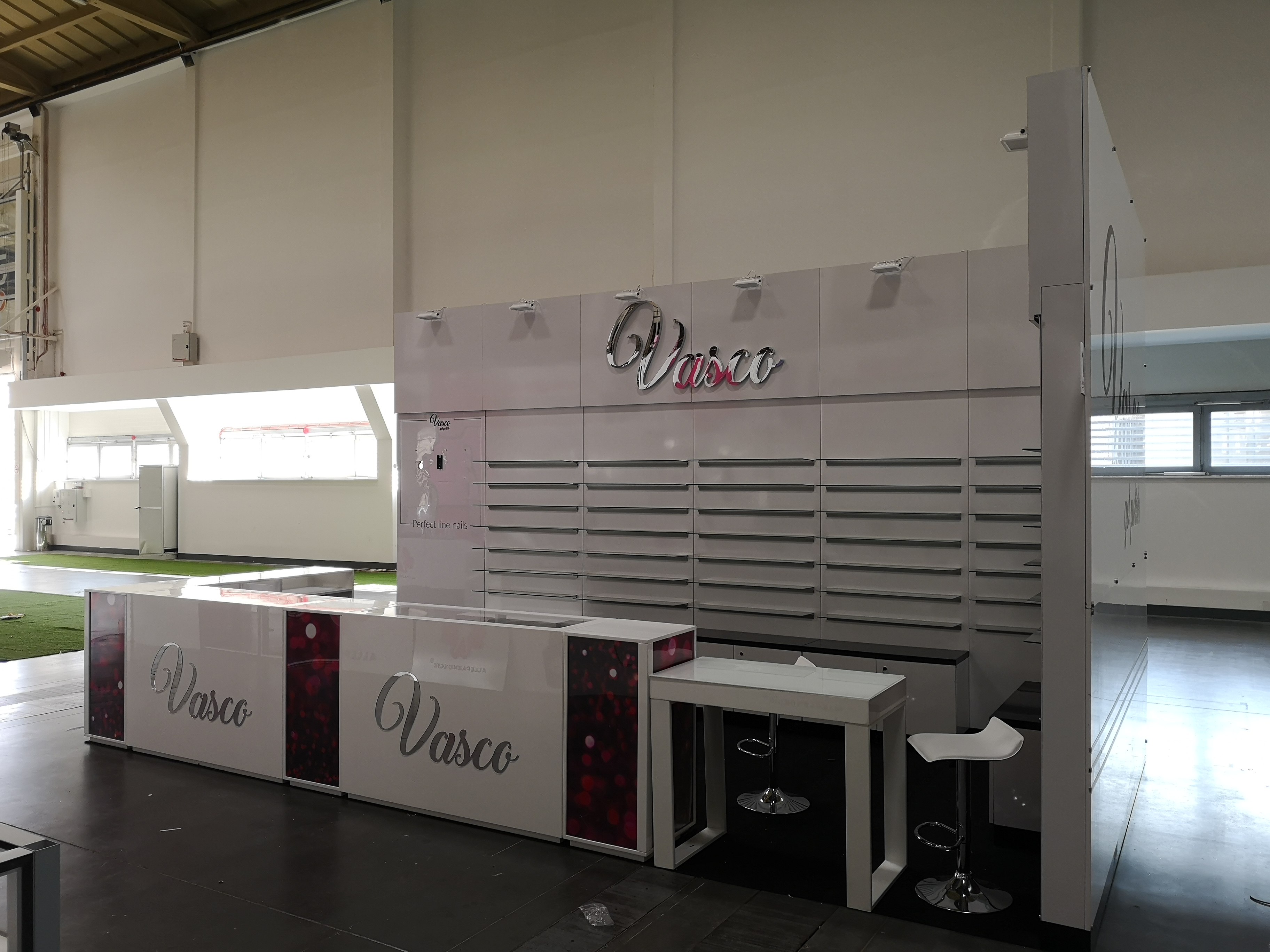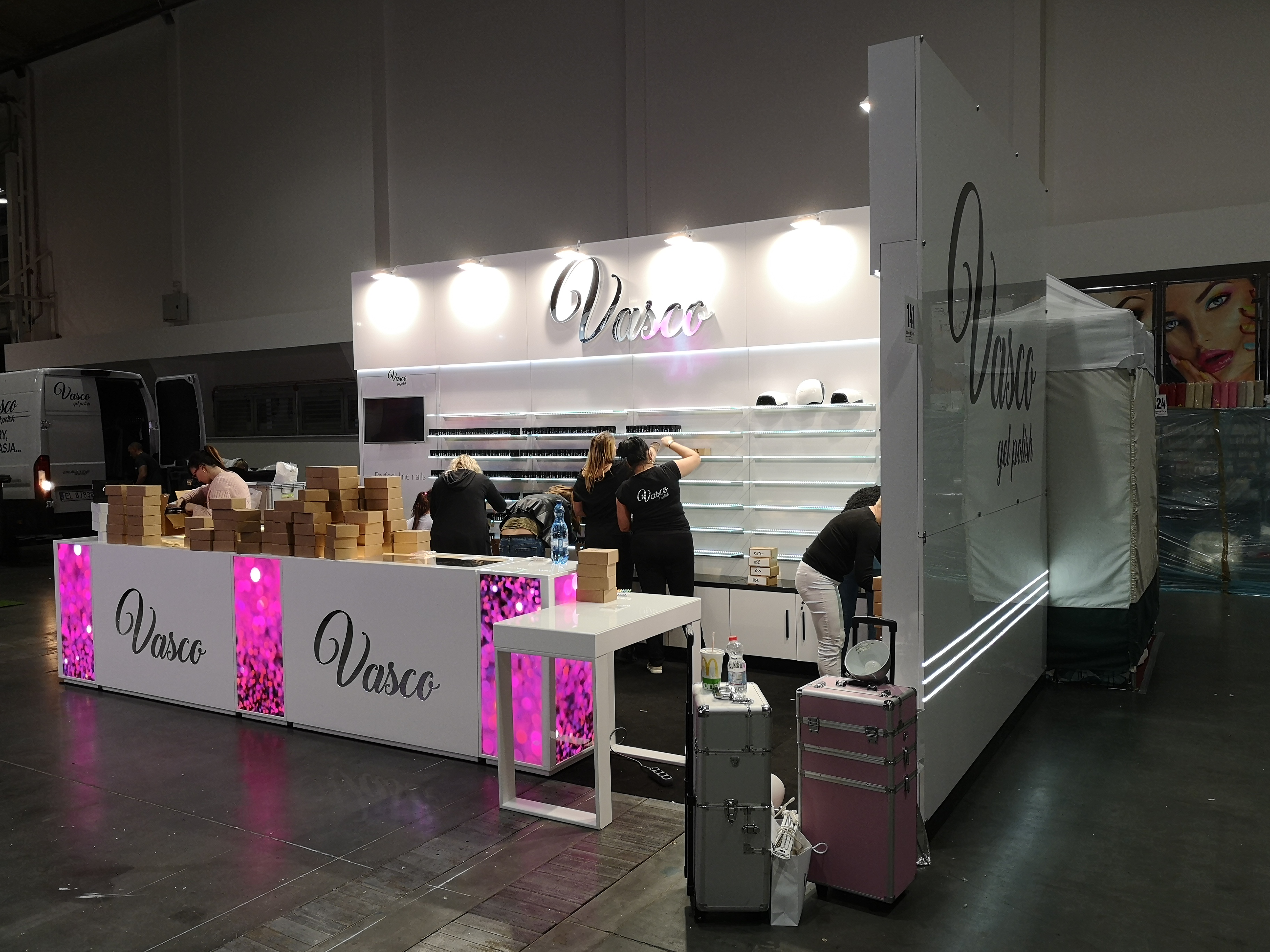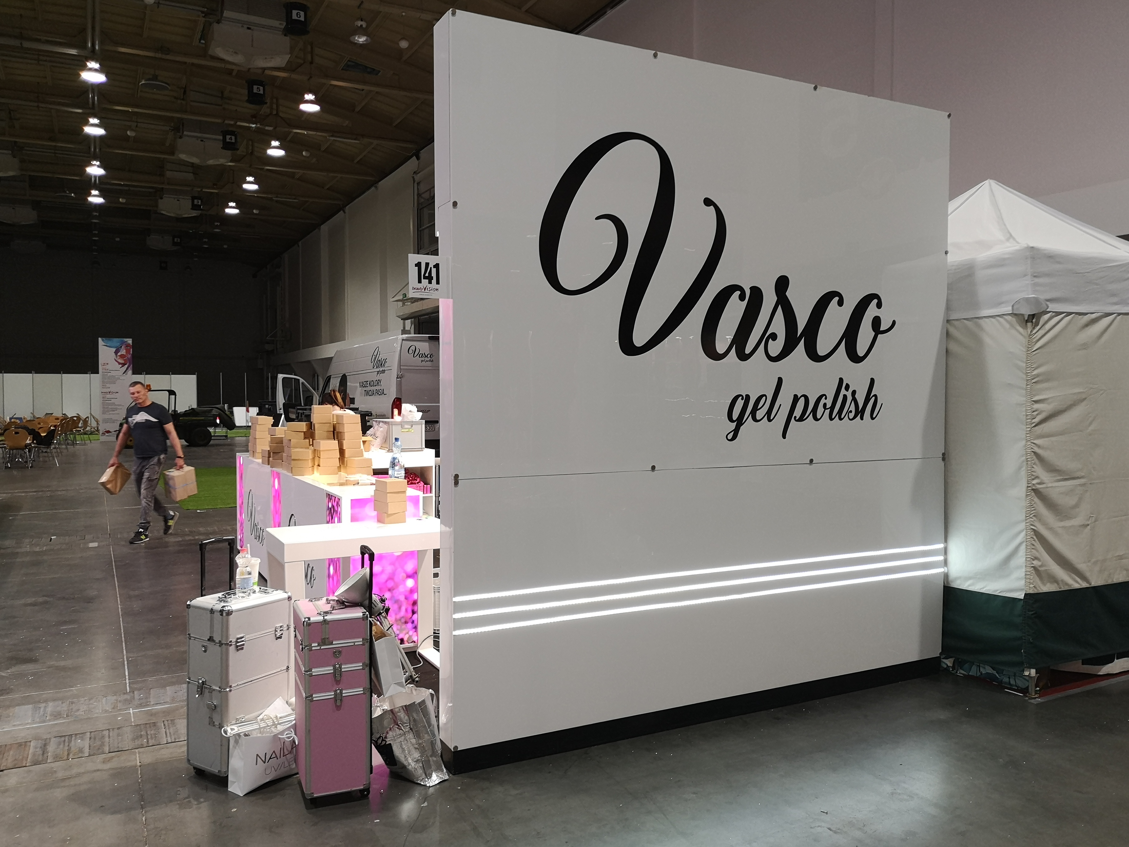 Na targach Beauty Vision 2019 edycja wiosenna wykonaliśmy powiększone i odświeżone stoisko dla Vasco Cosmetics. Zabudowa targowa miała powierzchnię 18 m2 (3 x 6 m obrysu). Stoisko posiadało nowe fronty lakierowane z grafikami podświetlanymi oraz dobraną pod nie wykładzinę wysokiej jakości w kolorze czarnym. Na nadstawce pojawiły się nowe loga lustrzane 3D nawiązujące do lustrzanych logotypów na ladach. Tylna ściana posiadała półki szklane z podświetleniami LED oraz dodatkowe doświetlenia LED z nadstawek. Pod półkami wykonano szafki i szuflady do magazynowania towaru. Mimo, że stoisko było wyspowe, dla lepszego wykorzystania przestrzeni wykonano ścianę narożna z półkami i podświetlanym kasetonem. Z drugiej strony zabudowy, przy pasażu, pojawiła się ścianka w połysku z dużym logiem do robienia zdjęć. Mamy nadzieję, że na kolejnej imprezie stoisko będzie jeszcze większe, z nowymi intrygującymi elementami.