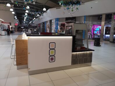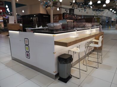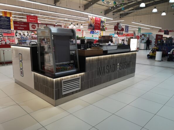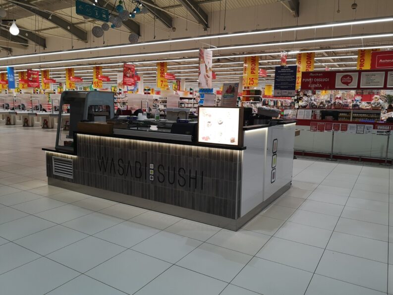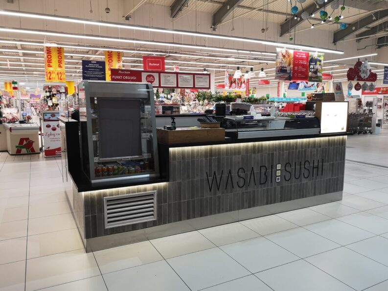 Wasabi sushi to nieduże punkty gastronomiczne, które zostały zaprojektowane na planie prostokąta. Wymiary wysp to około 3 x 4 m. Taka powierzchnia zapewnia wygodną obsługę Klientów oraz wystarczającą ilość blatów roboczych. Ciemne blaty są wykonane z podwójnej płyty meblowej oraz zalaminowane wytrzymałym materiałem HPL. Dzięki temu sprawdzą się w warunkach, w których trudno jest utrzymać czystość.