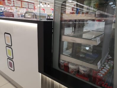 Wyspy wykończone są płytami lakierowanymi w kolorze białym lub płytkami ceramicznymi. Natomiast wstawki drewnopodobne wykończone laminatem HPL imitującym drewno oraz ciemne cokoły dodają wyspom elegancji. Ciekawy efekt wizualny uzyskaliśmy dzięki podświetlanym kasetonom wbudowanym w obrys wyspy. Tego typu akcesoria dają duże możliwości dekoracyjne oraz funkcjonalne. W kasetonach mogą być wyklejone infografiki czy menu. Cała wyspa jest podświetlona paskami LED, co sprawia, że jest widoczna z daleka. Duże logotypy w elewacjach sprawiają, że nazwa zapadnie Klientom w pamięć.