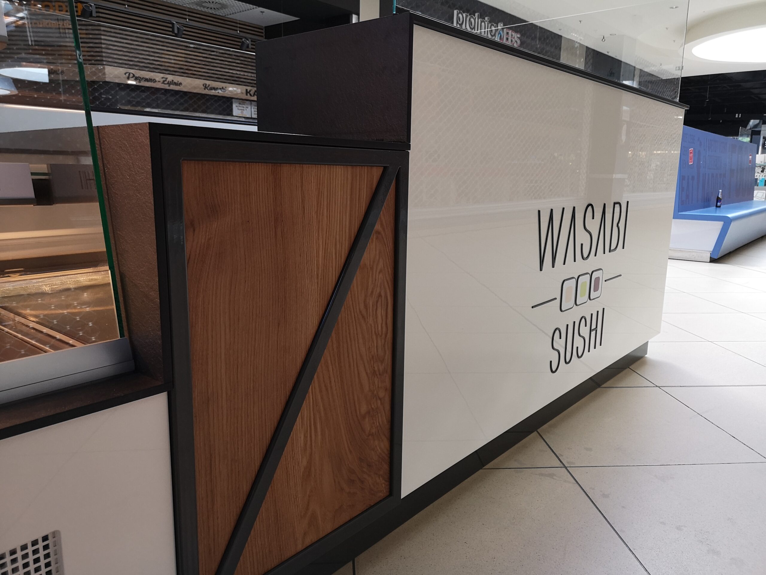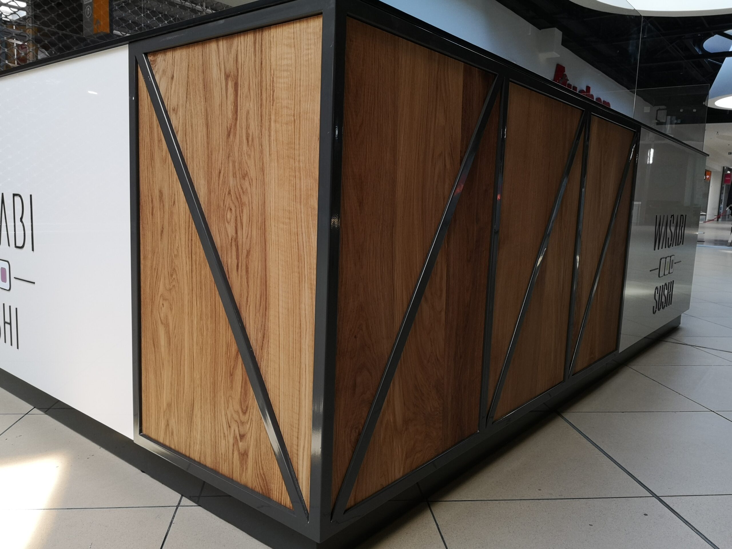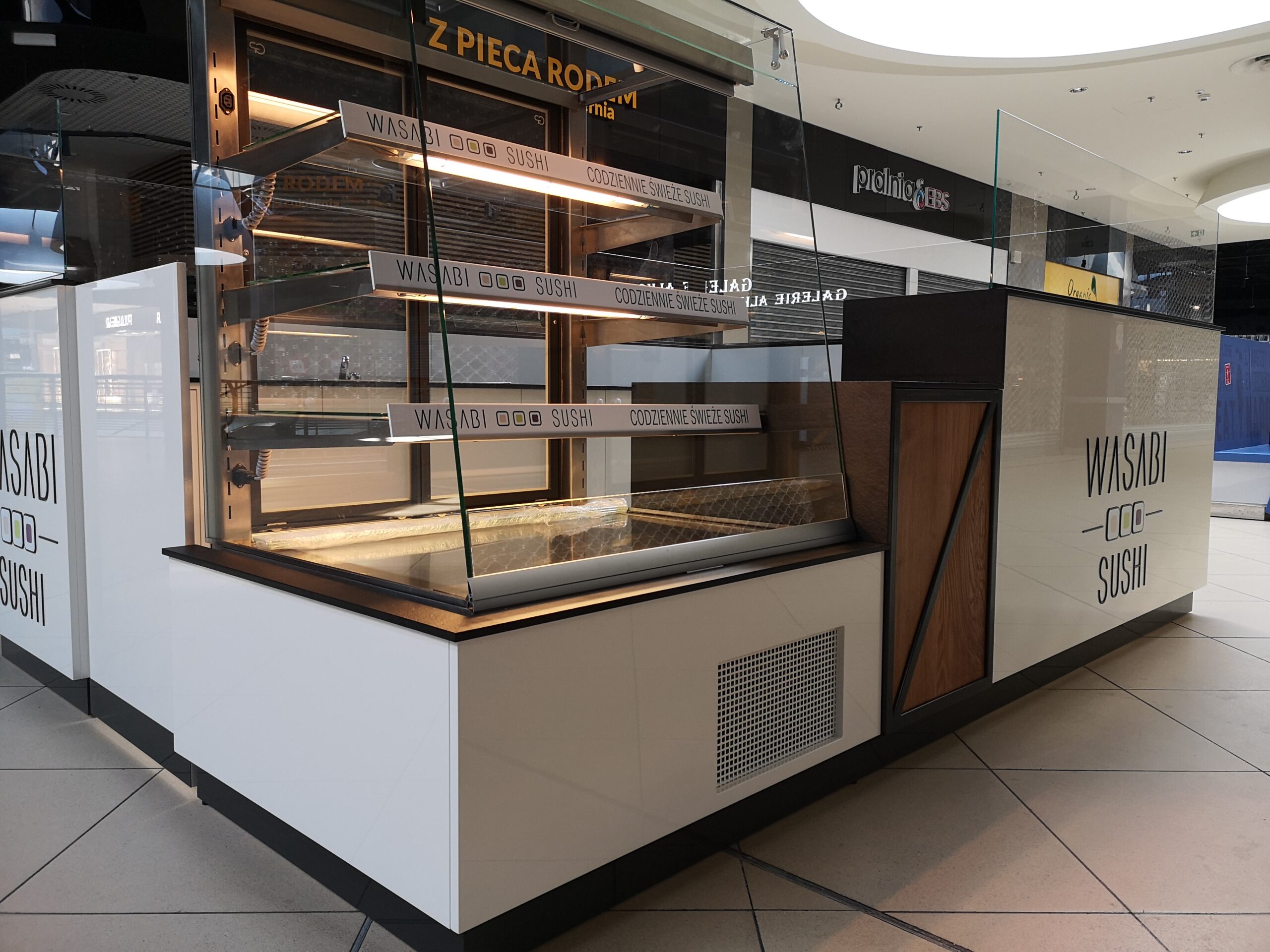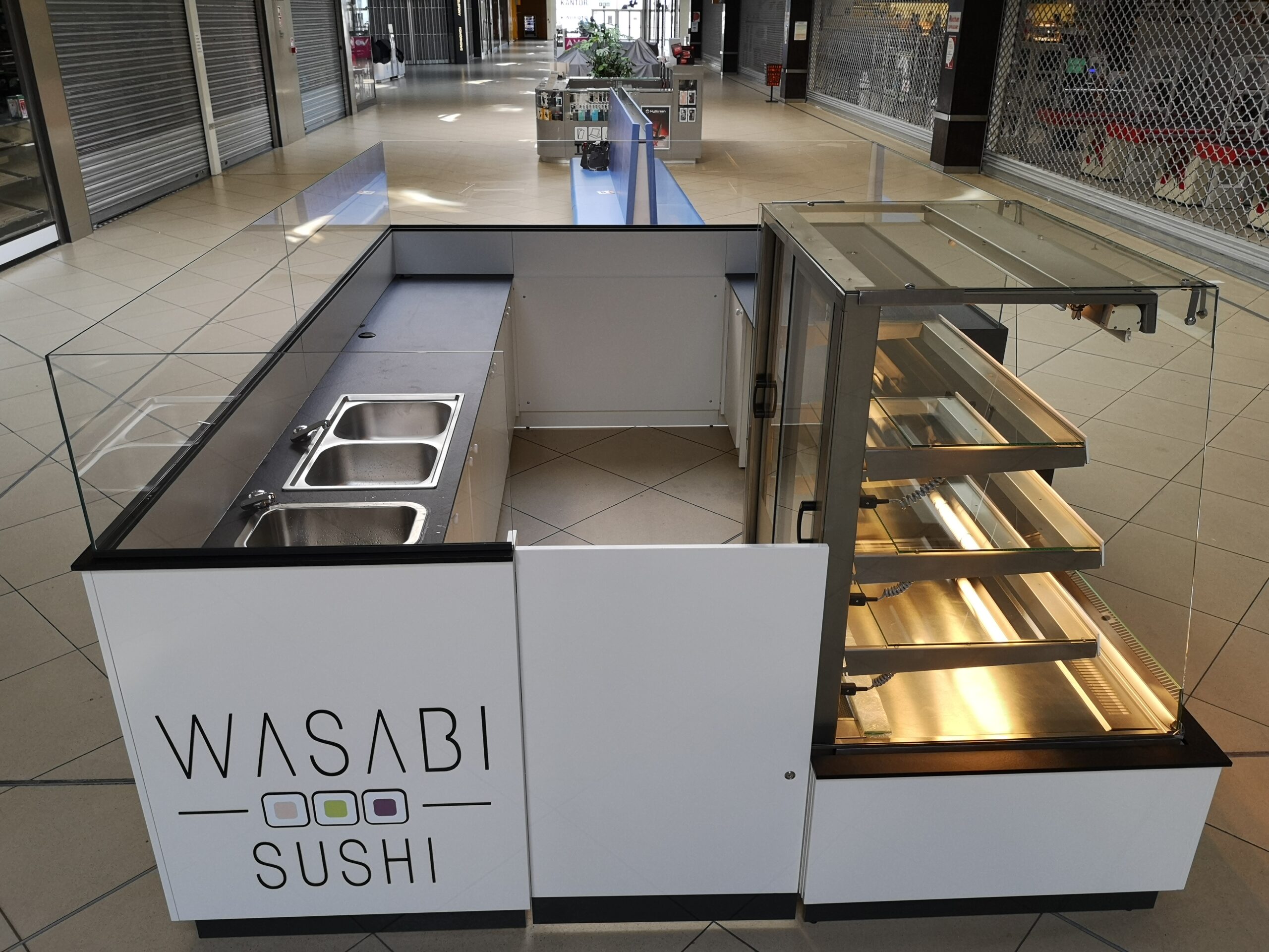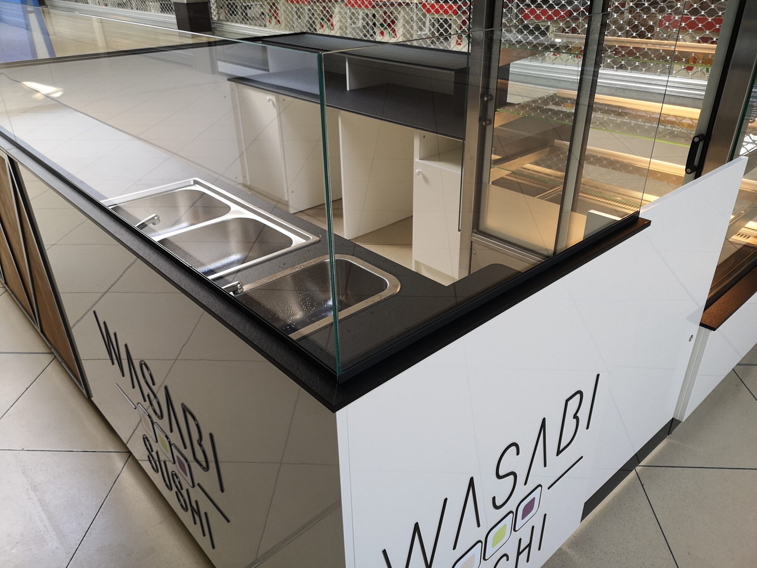 Wasabi sushi to nieduże punkty gastronomiczne, które zostały zaprojektowane na planie prostokąta. Wymiary wysp to około 3 x 4 m. Taka powierzchnia zapewnia wygodną obsługę Klientów oraz wystarczającą ilość blatów roboczych. Ciemne blaty są wykonane z podwójnej płyty meblowej oraz zalaminowane wytrzymałym materiałem HPL. Dzięki temu sprawdzą się w warunkach, w których trudno jest utrzymać czystość.
