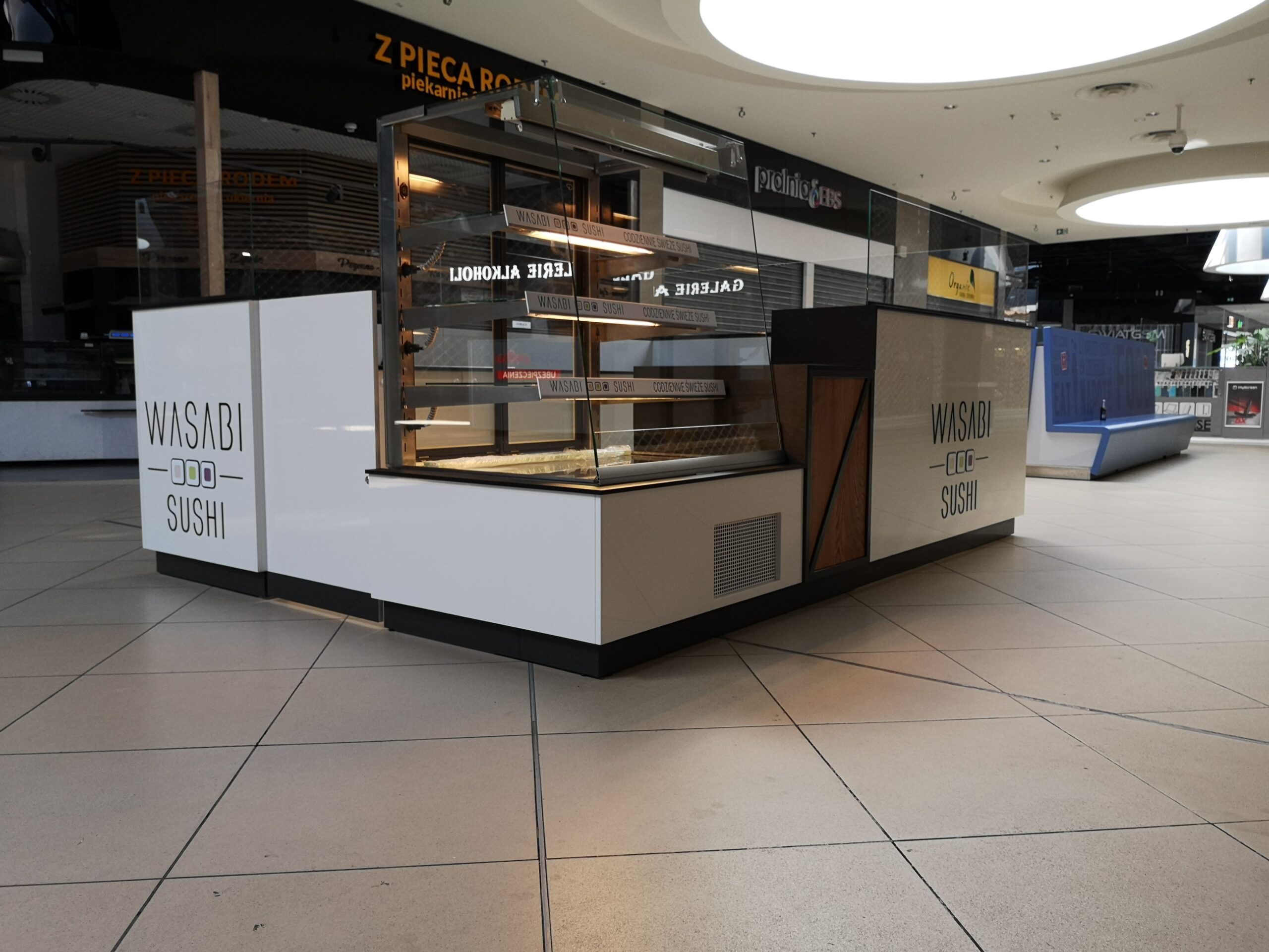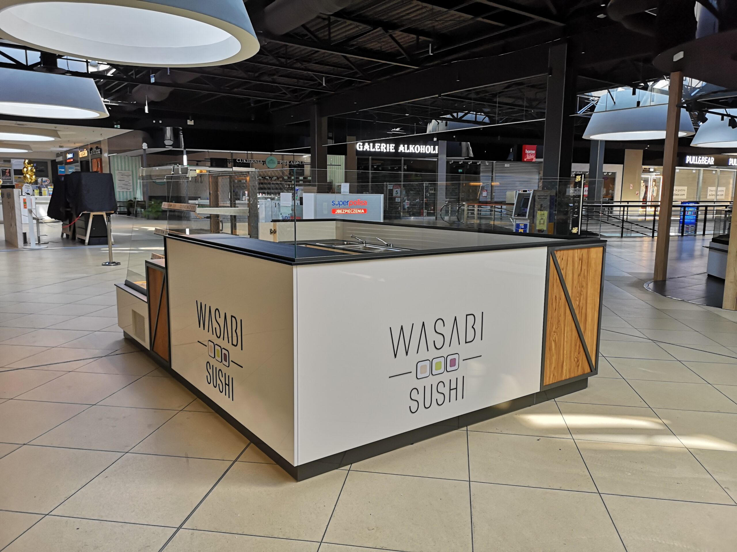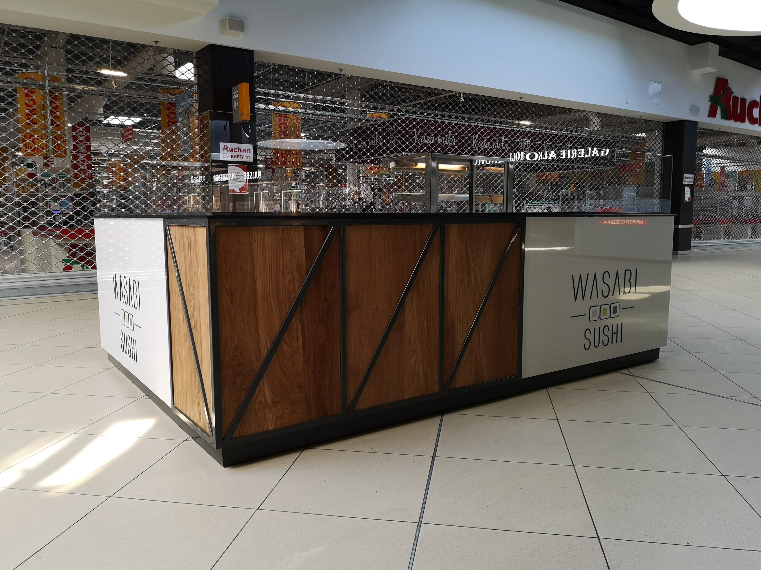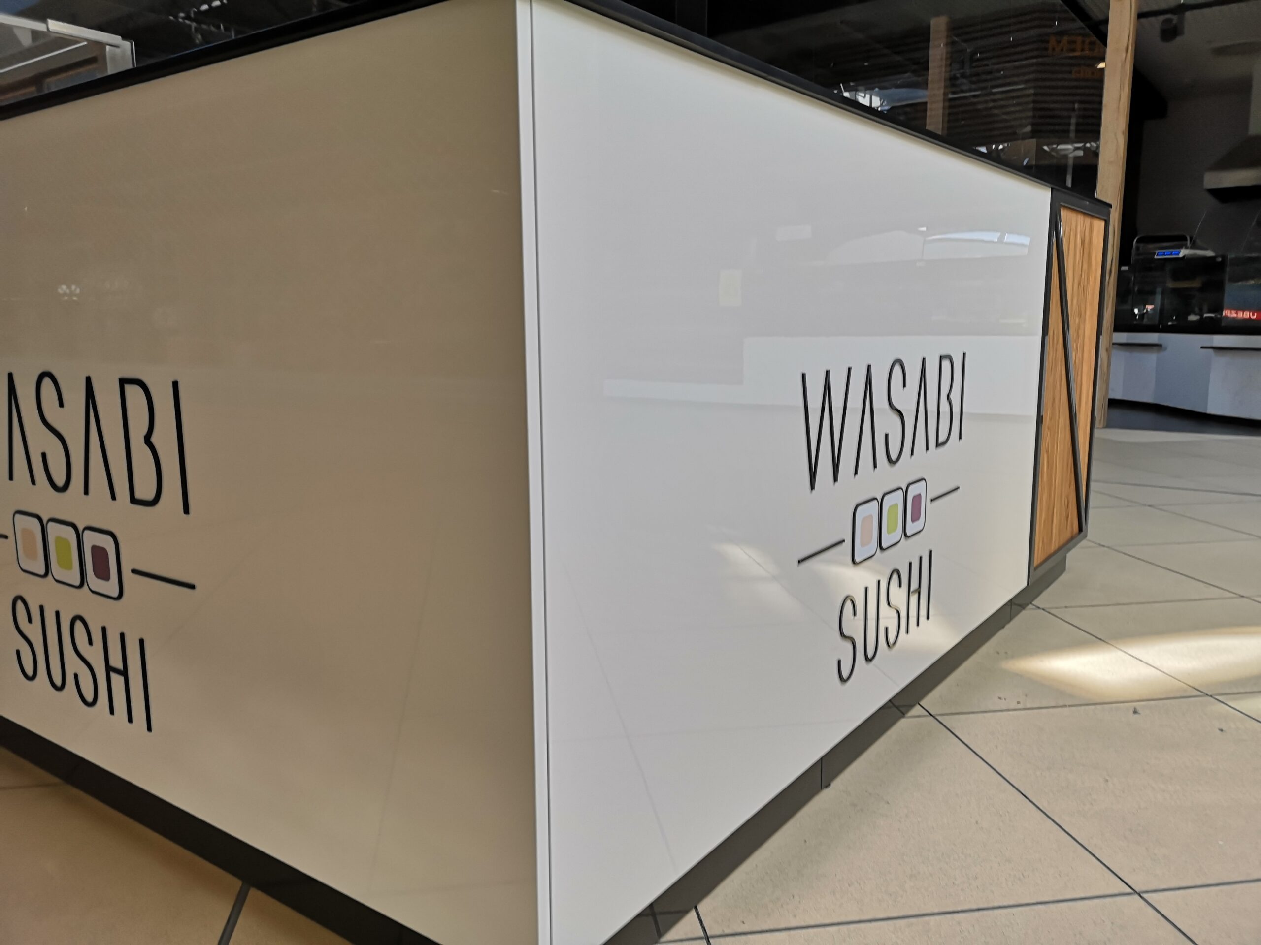Wasabi sushi to nieduże punkty gastronomiczne, które zostały zaprojektowane na planie prostokąta. Wymiary wysp to około 3 x 4 m. Taka powierzchnia zapewnia wygodną obsługę Klientów oraz wystarczającą ilość blatów roboczych. Ciemne blaty są wykonane z podwójnej płyty meblowej oraz zalaminowane wytrzymałym materiałem HPL. Dzięki temu sprawdzą się w warunkach, w których trudno jest utrzymać czystość.