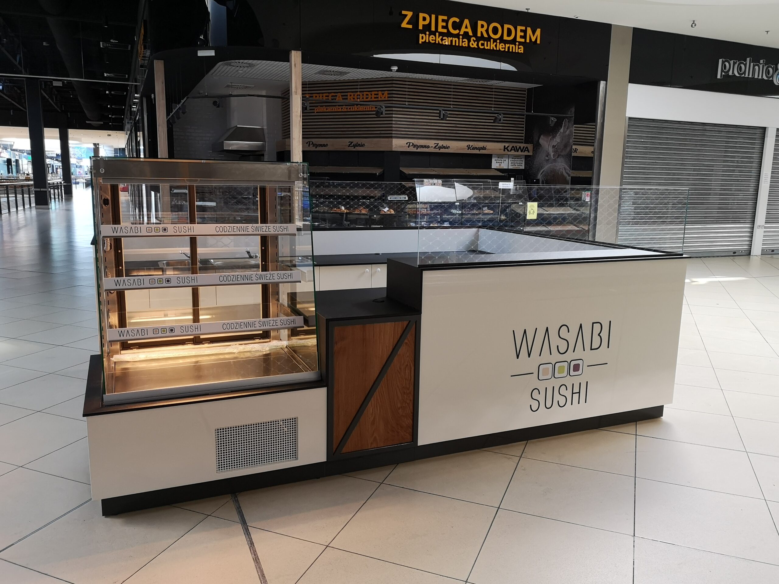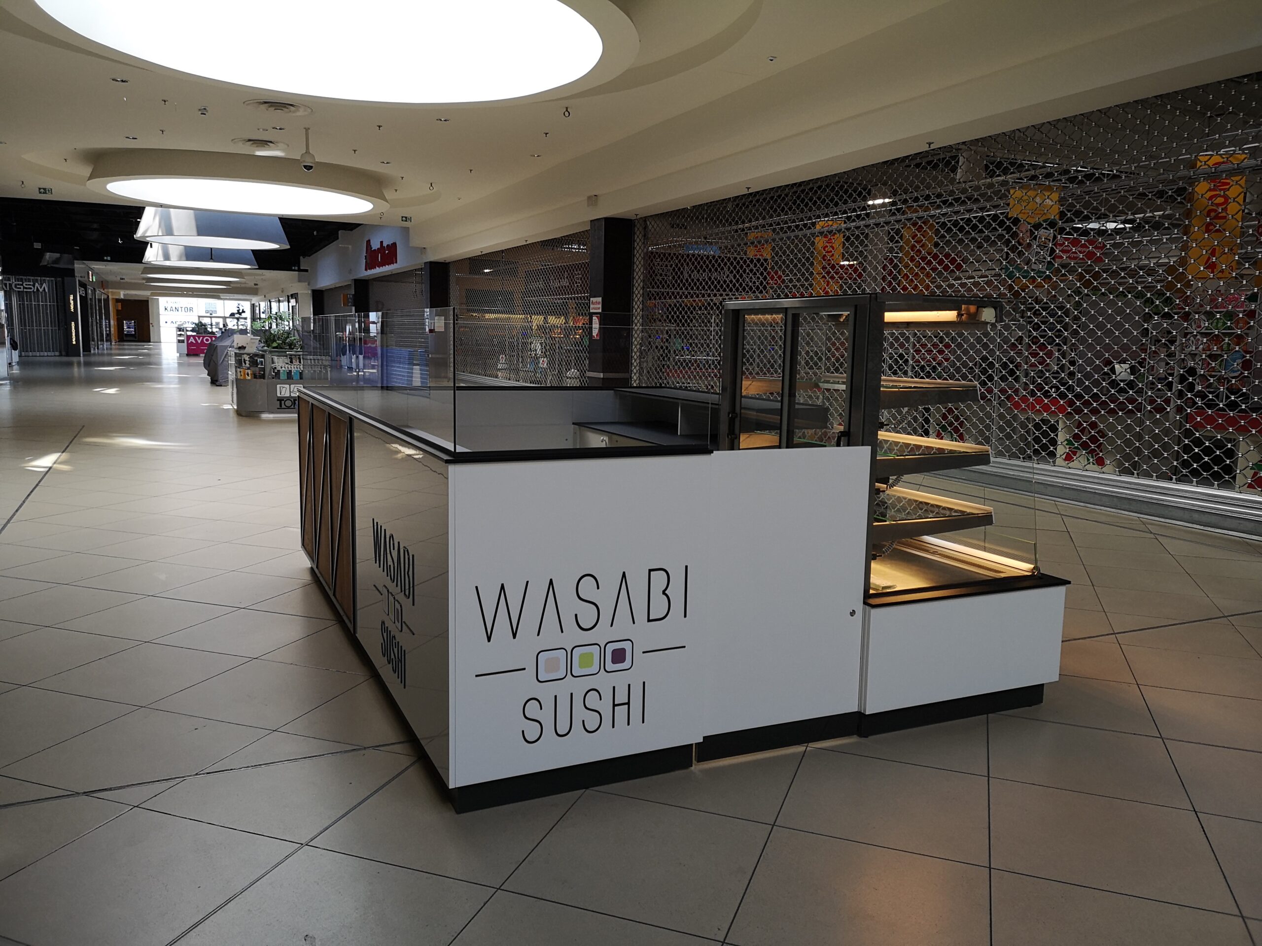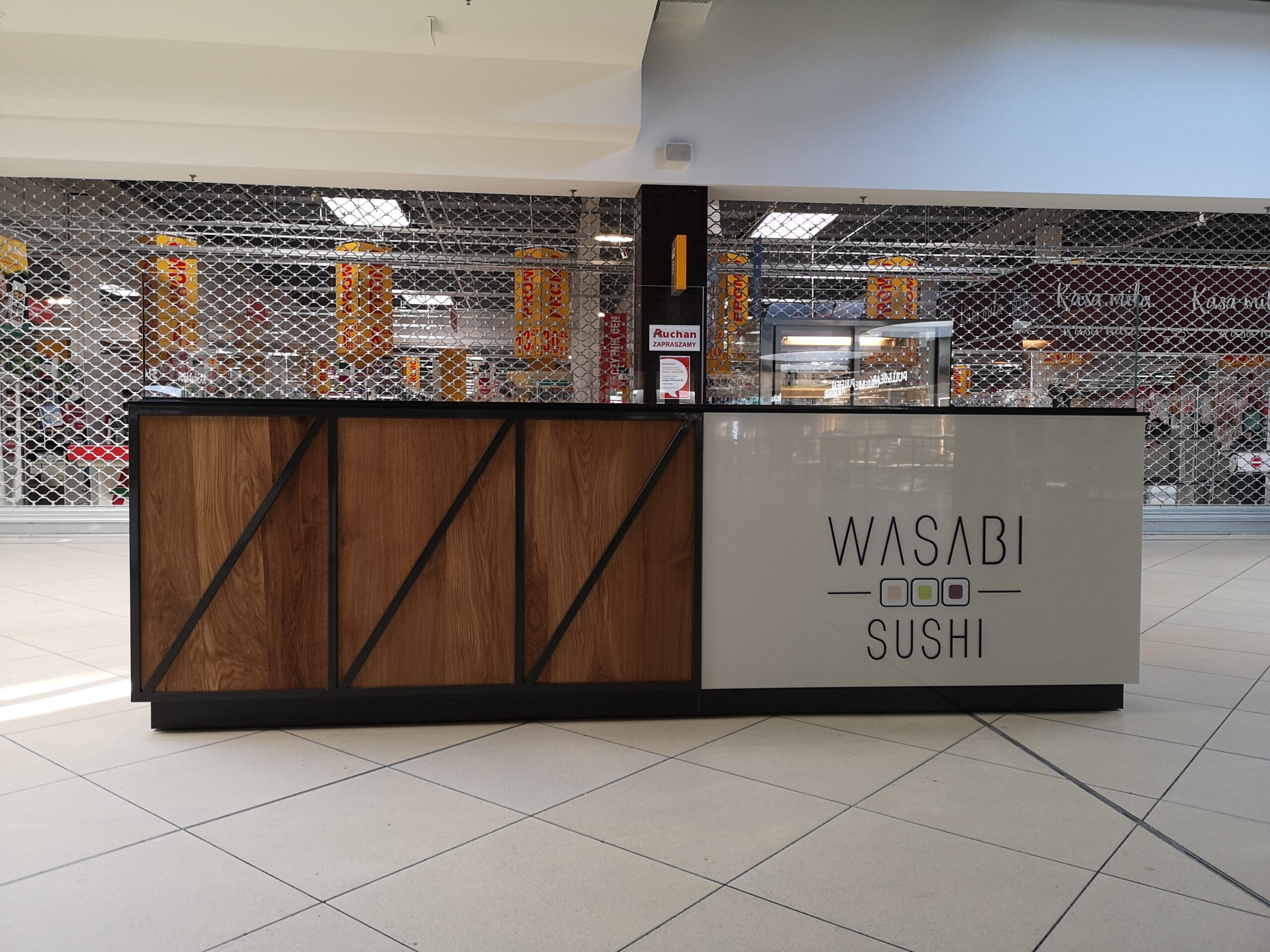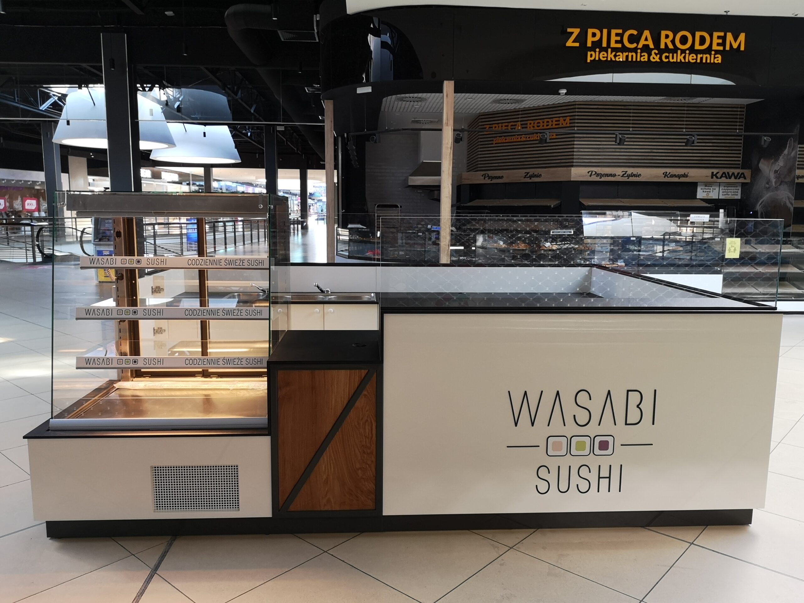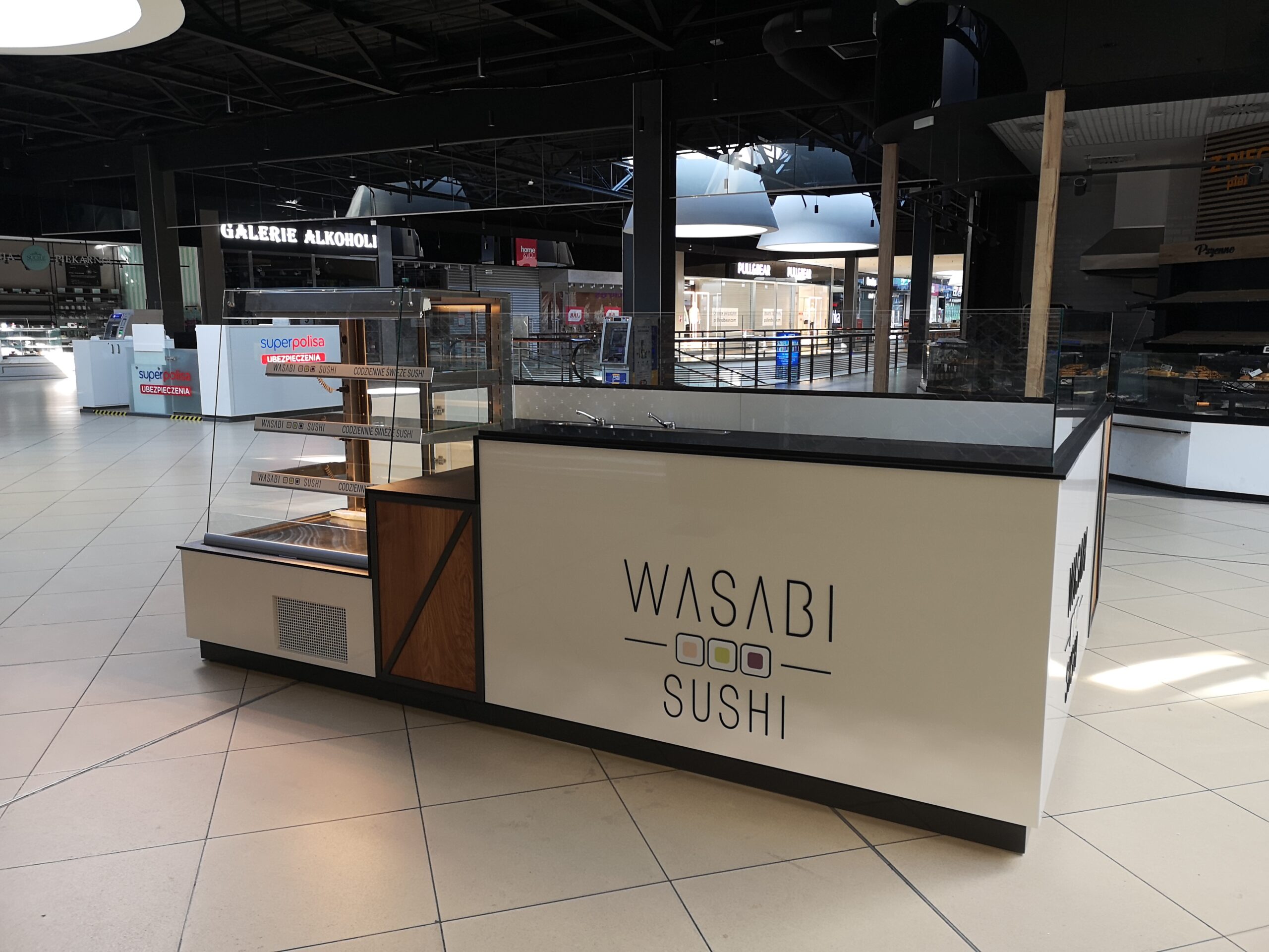 Wasabi sushi to nieduże punkty gastronomiczne, które zostały zaprojektowane na planie prostokąta. Wymiary wysp to około 3 x 4 m. Taka powierzchnia zapewnia wygodną obsługę Klientów oraz wystarczającą ilość blatów roboczych. Ciemne blaty są wykonane z podwójnej płyty meblowej oraz zalaminowane wytrzymałym materiałem HPL. Dzięki temu sprawdzą się w warunkach, w których trudno jest utrzymać czystość.