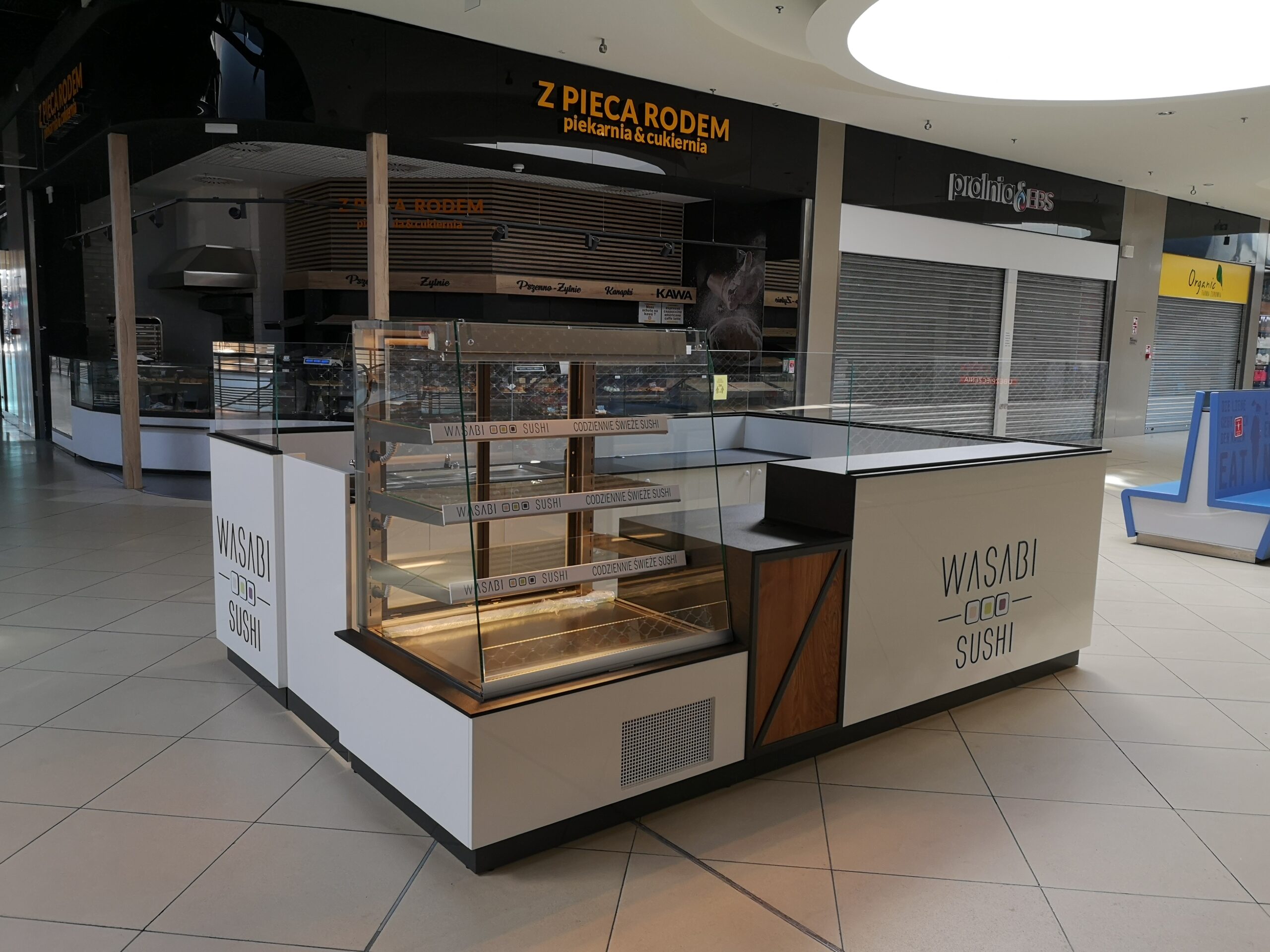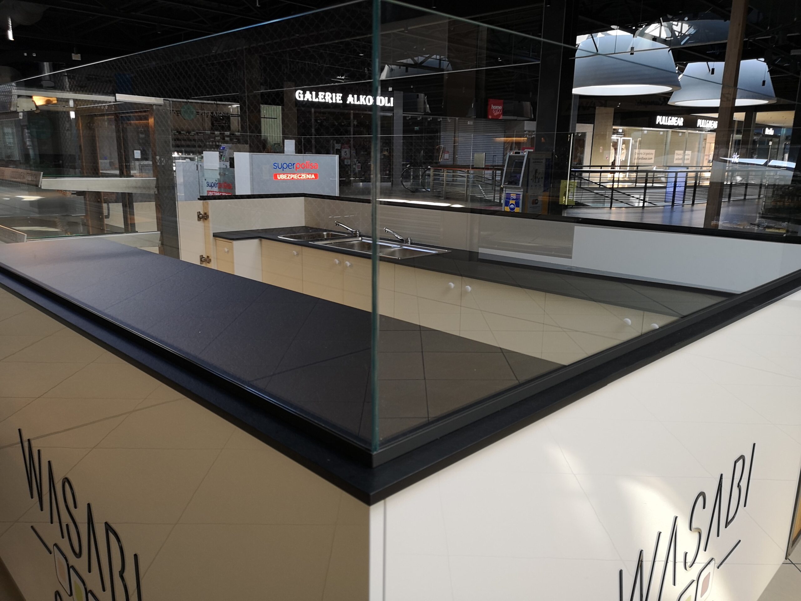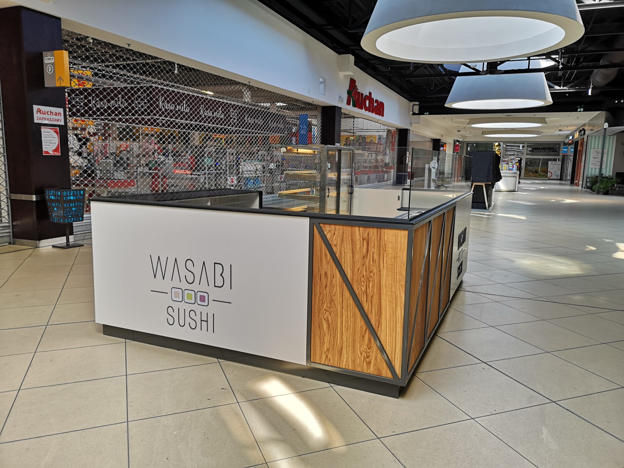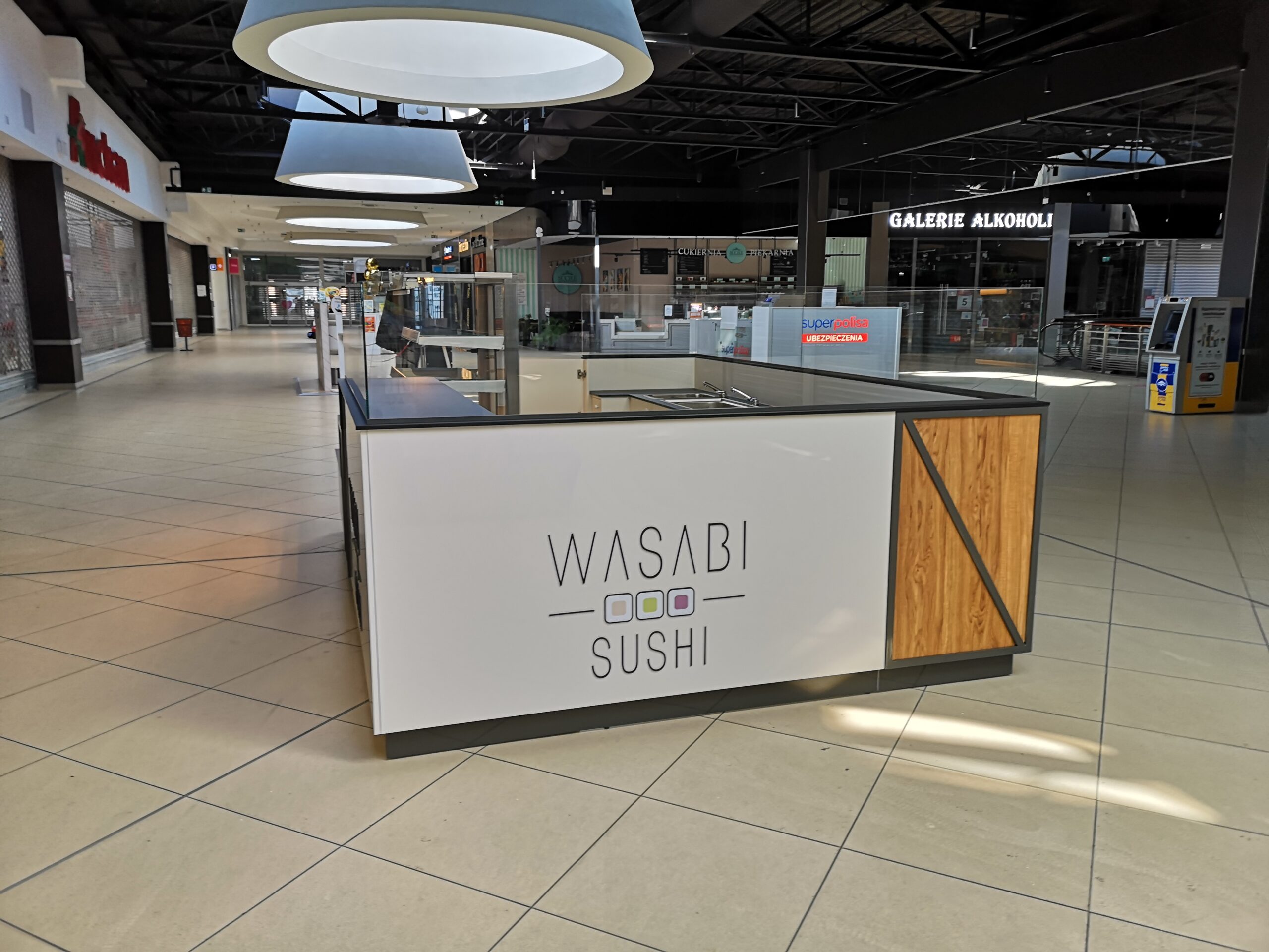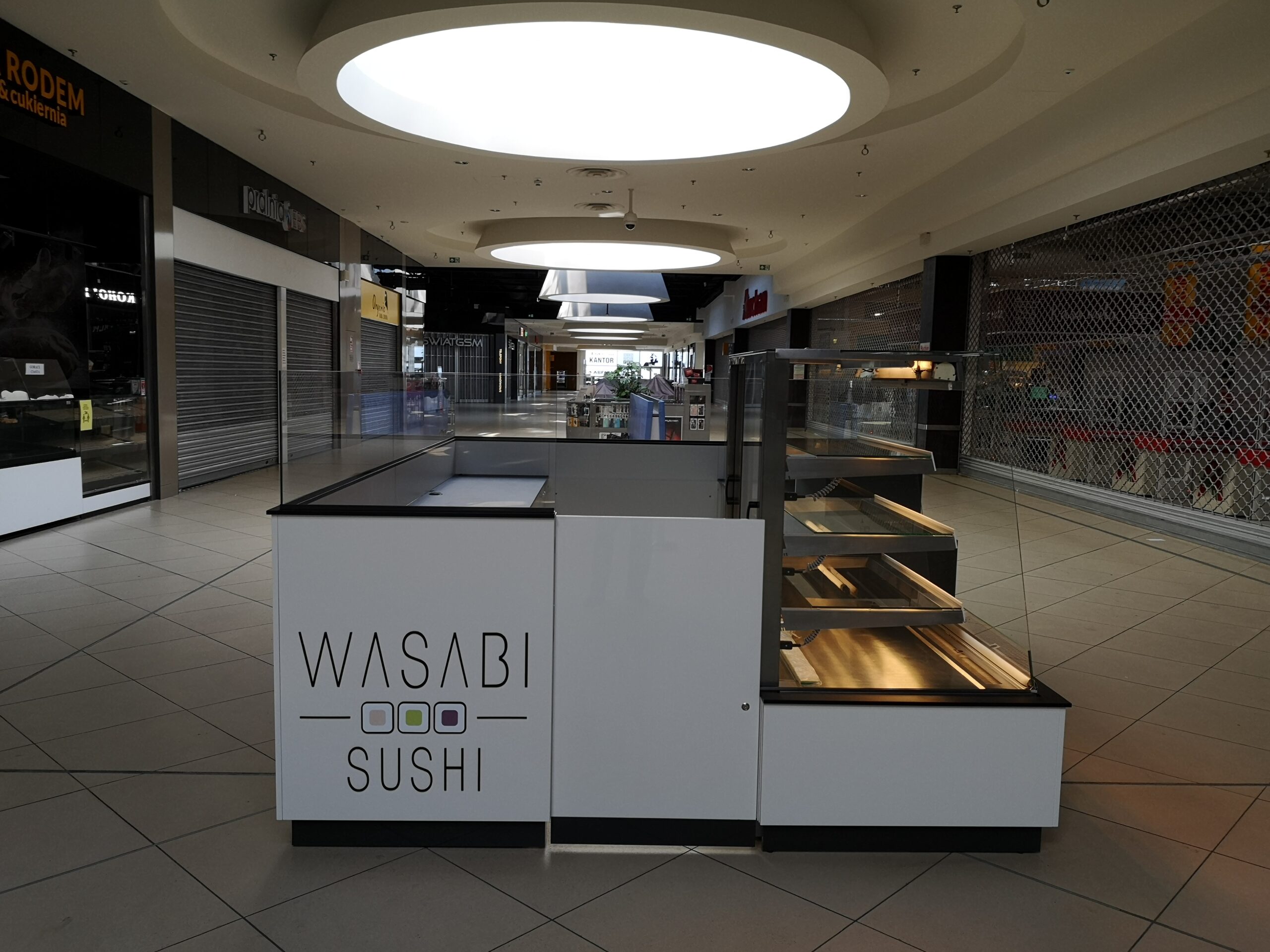 Wasabi sushi to nieduże punkty gastronomiczne, które zostały zaprojektowane na planie prostokąta. Wymiary wysp to około 3 x 4 m. Taka powierzchnia zapewnia wygodną obsługę Klientów oraz wystarczającą ilość blatów roboczych. Ciemne blaty są wykonane z podwójnej płyty meblowej oraz zalaminowane wytrzymałym materiałem HPL. Dzięki temu sprawdzą się w warunkach, w których trudno jest utrzymać czystość.