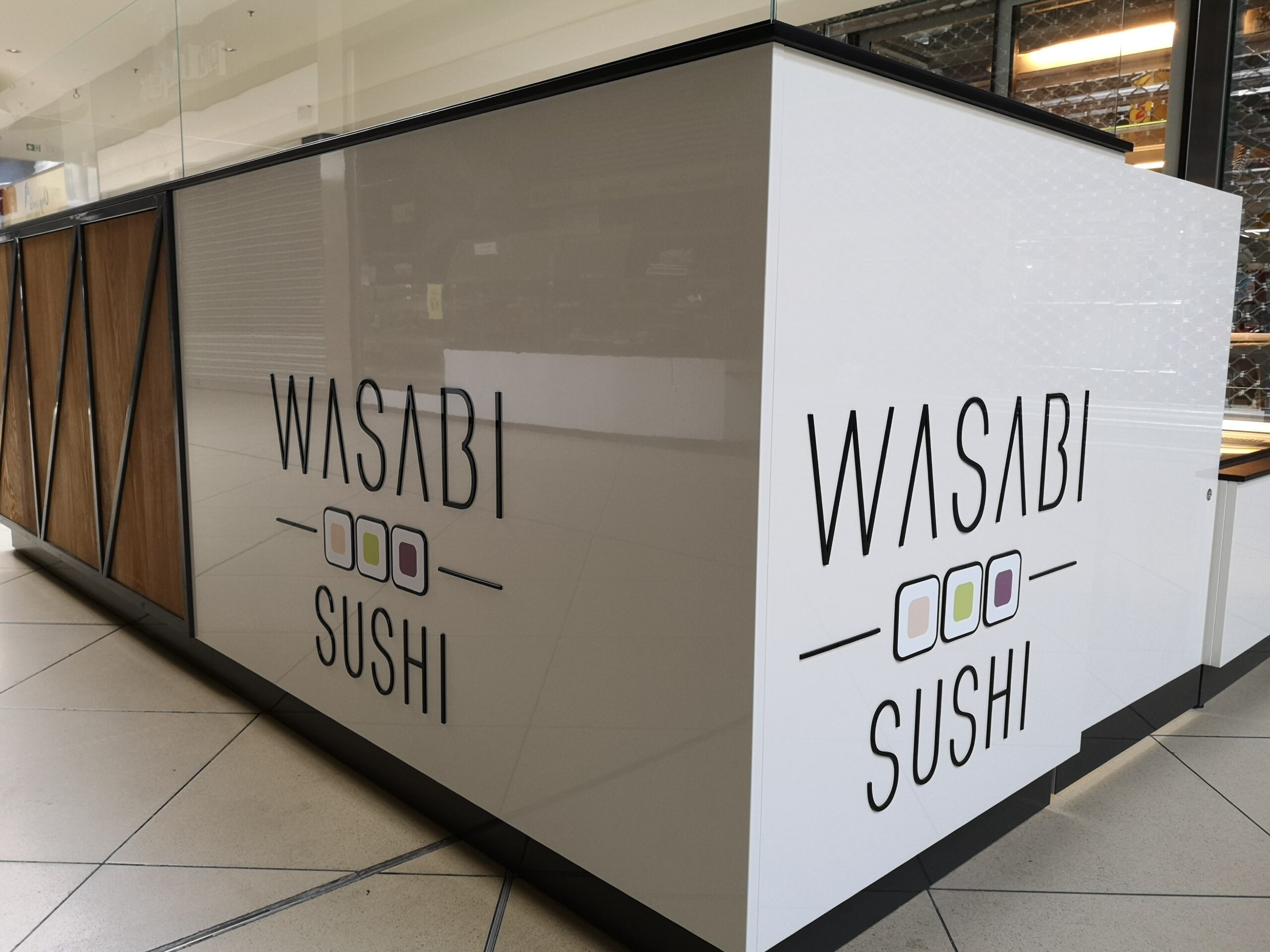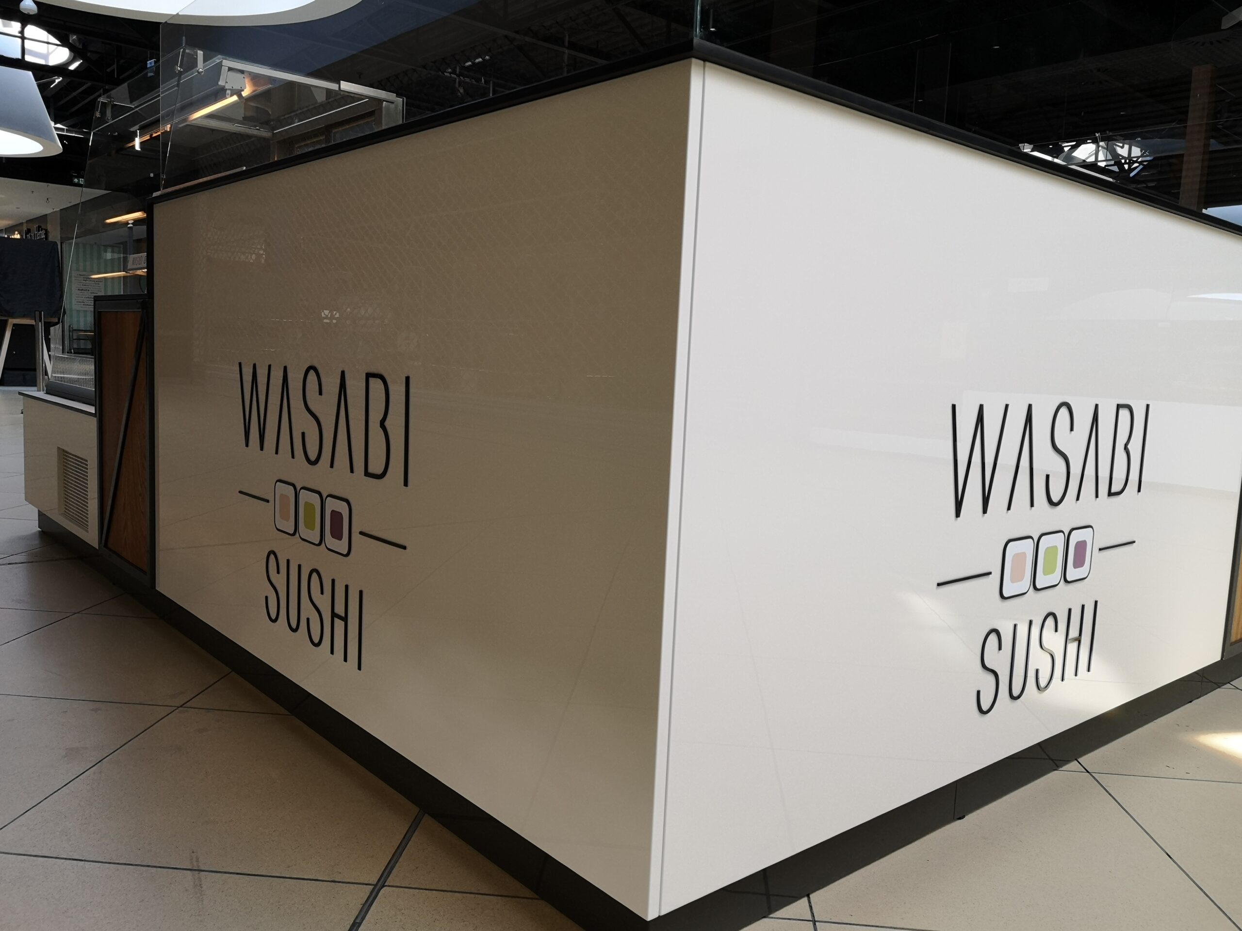 Wyspy wykończone są płytami lakierowanymi w kolorze białym lub płytkami ceramicznymi. Natomiast wstawki drewnopodobne wykończone laminatem HPL imitującym drewno oraz ciemne cokoły dodają wyspom elegancji. W Wasabi Sushi w łódzkiej manufakturze dodatkowo została wykonana stalowa konstrukcja. Ciekawy efekt wizualny uzyskaliśmy dzięki podświetlanym kasetonom wbudowanym w obrys wyspy. Tego typu akcesoria dają duże możliwości dekoracyjne oraz funkcjonalne. W kasetonach mogą być wyklejone infografiki czy menu. Cała wyspa jest podświetlona paskami LED, co sprawia, że jest widoczna z daleka. Duże logotypy w elewacjach sprawiają, że nazwa zapadnie Klientom w pamięć.