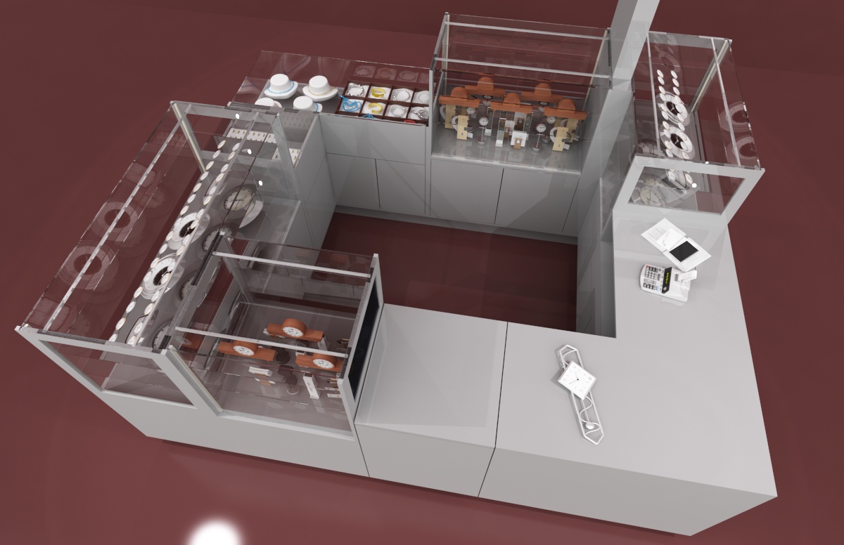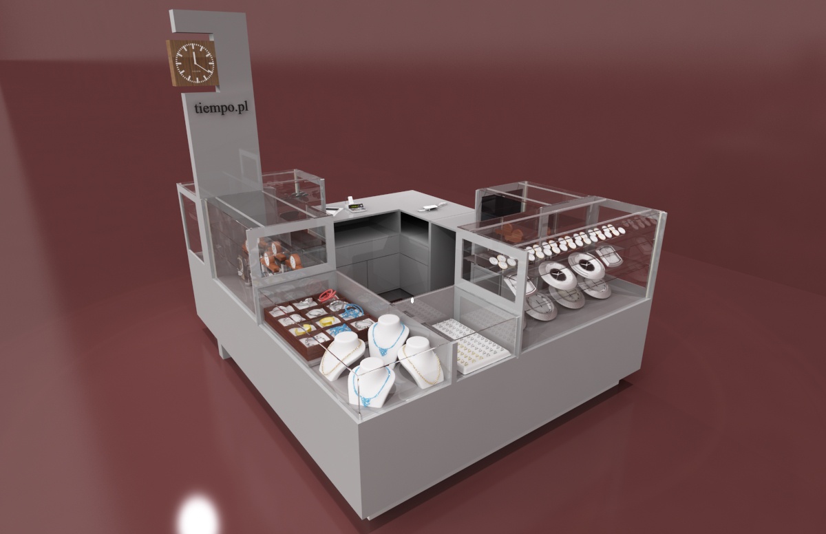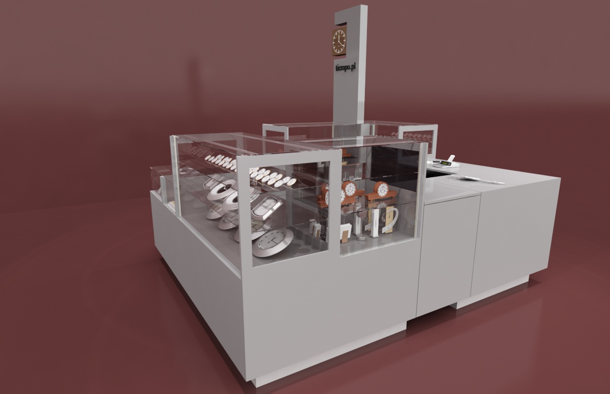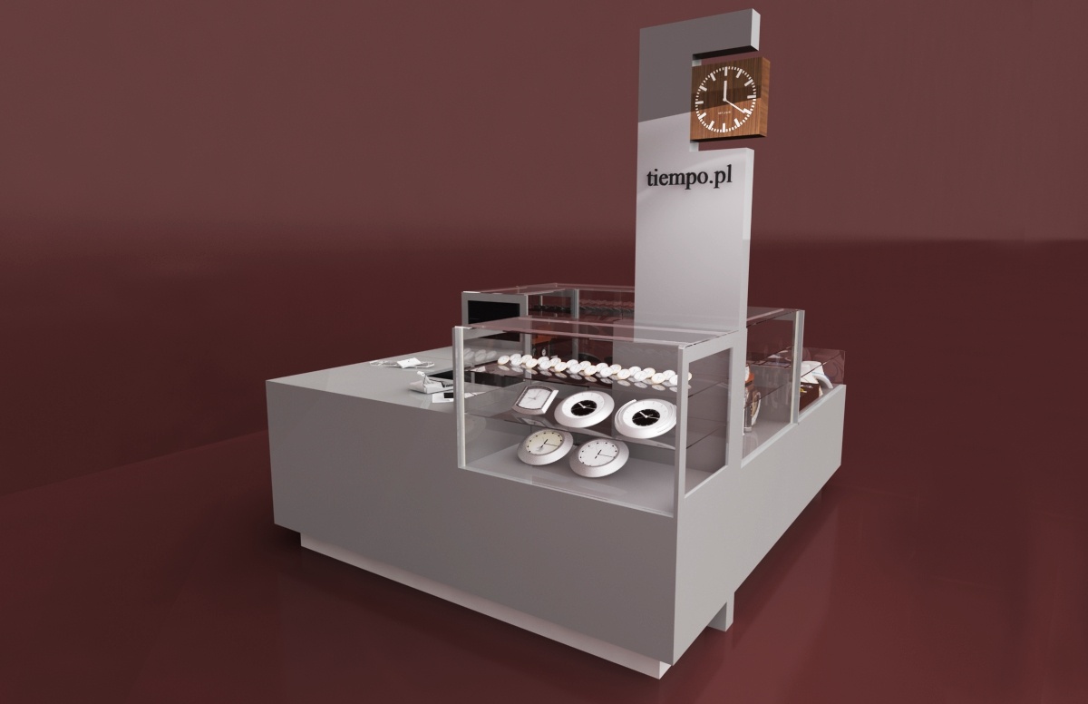 Wyspa handlowa sprzedaży zegarków, zaprojektowana i postawiona w CH Manufaktura w Łodzi. Wyspa handlowa lakierowana na wysoki połysk, z gablotami szklanymi prezentującymi produkty w postaci zegarków.