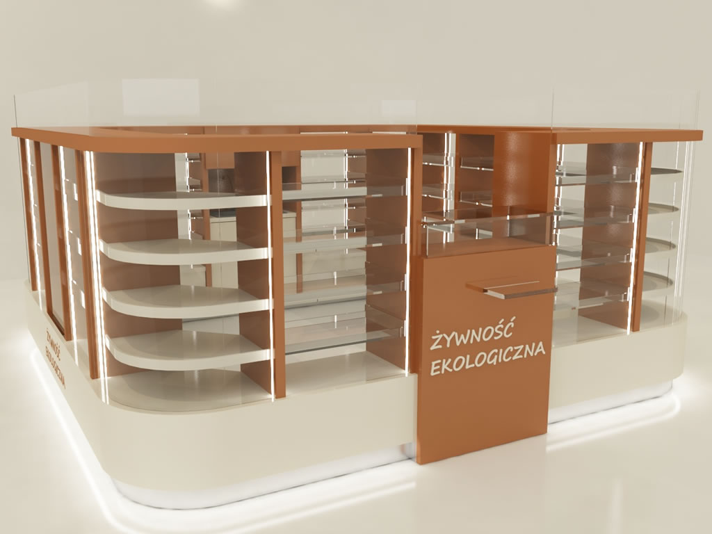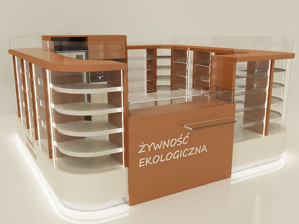 Propozycja wyspy handlowo sprzedażowej, oferującej różnego rodzaju żywność ekologiczną.