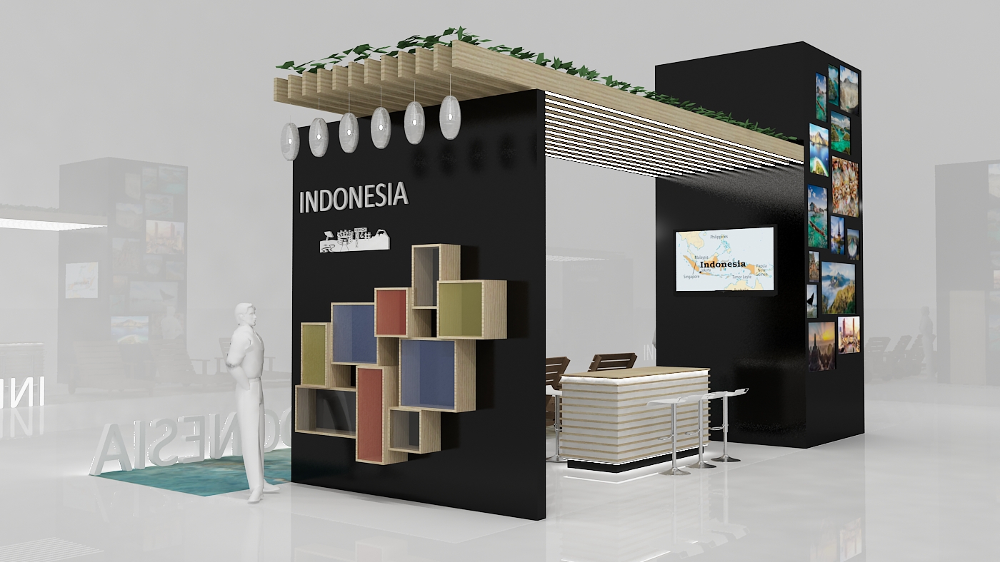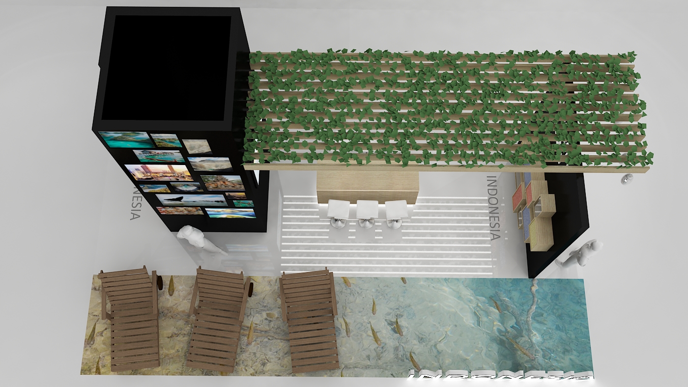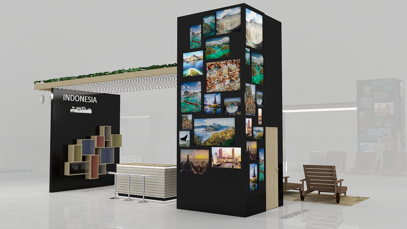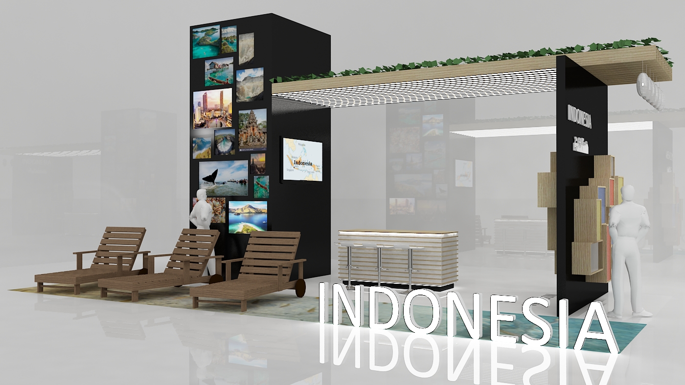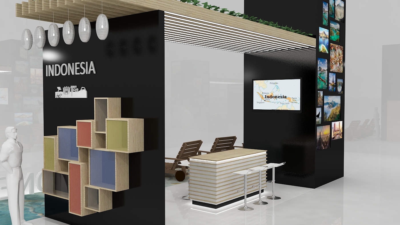 Stoisko modułowe, wielorazowe na targi turystyki i wypoczynku na małą powierzchnię wystawienniczą projektowane na Travel Show w Poznaniu, Tour Salon MTP Poznań, targi Wiatr i Woda w Gdyni oraz Międzynarodowe targi turystyczne TT WARSAW w Warszawie dla ambasady Indonezji – INDONESIA Polska. W stoisku zastosowano print floor z wydrukowaną grafiką dna morskiego, podłoga w białym połysku oraz połączenie naturalnej sklejki eko z czarnym połyskiem i kolorowymi szkłami bezpiecznymi – pleksiglas barwione w masie w różnych kolorach. Uwagę zwraca dominanta w postaci dużego pylonu o wysokości ponad 4 metrów mieszczącego małe zaplecze – kantorek z wbudowanymi grafikami, kasetonami, ramkami LED oraz ekranami LED TV. Strefa spotkań także została potraktowana bardziej swobodnie jako leżaki wypoczynkowe do posiedzenia i poczytania informacji wystawcy. W centralnej części pod podświetlanymi żyletkami, swoistą pergolą zlokalizowano barek /wyspę do posiedzenia, rozmów, wypicia koktajlu… Duże litery kasetonowe, wolnostojące dopełniają całości tworząc niepowtarzalne i niebanalne stoisko dla branży turystycznej oraz dla promocji kraju, regionu czy obszaru.