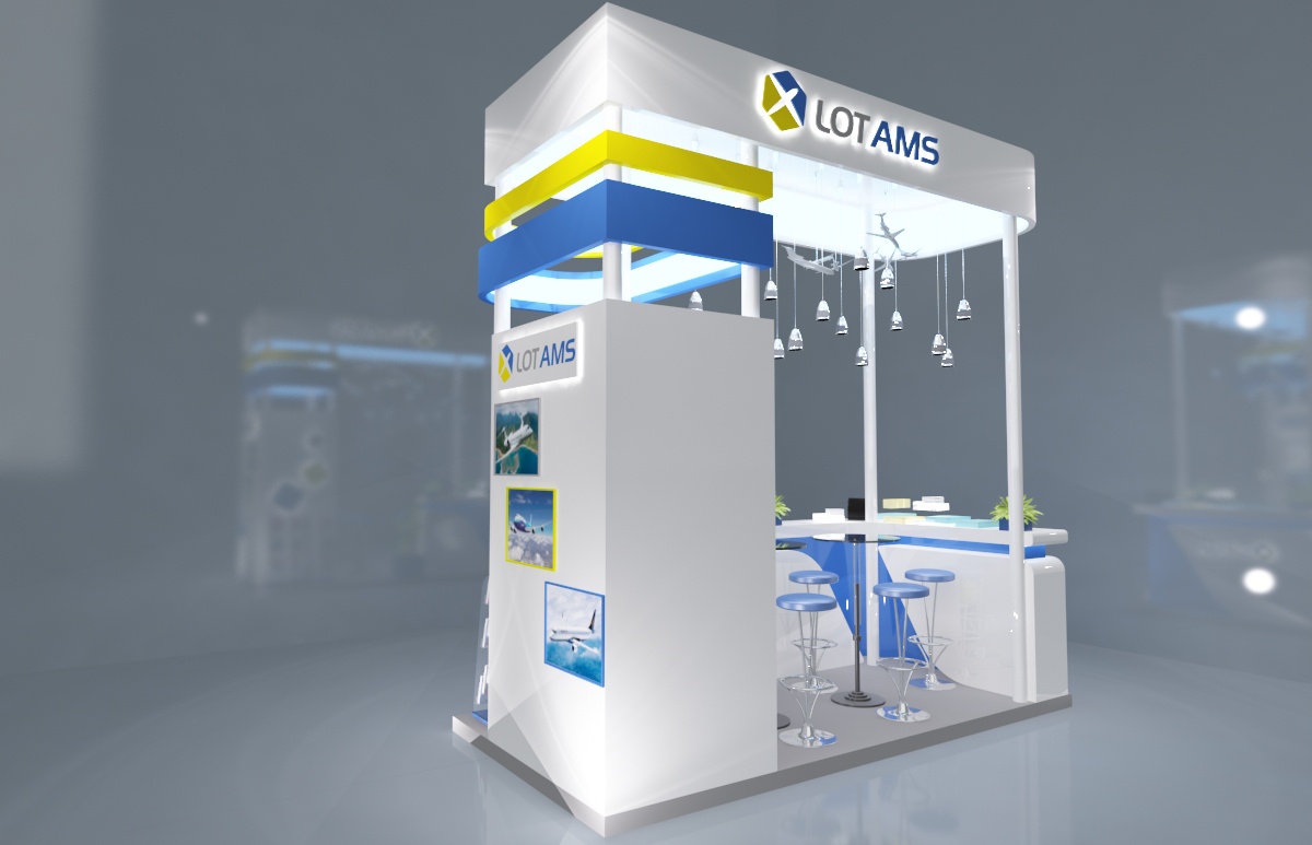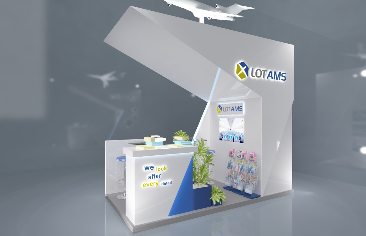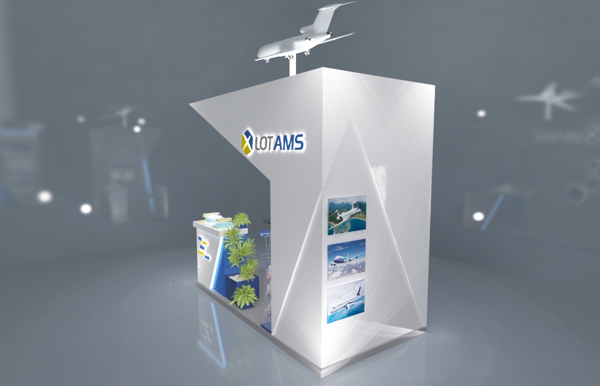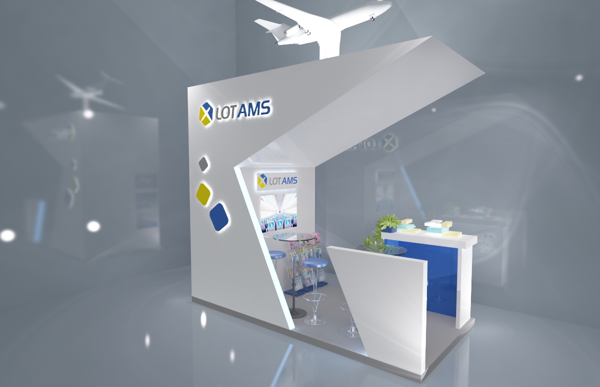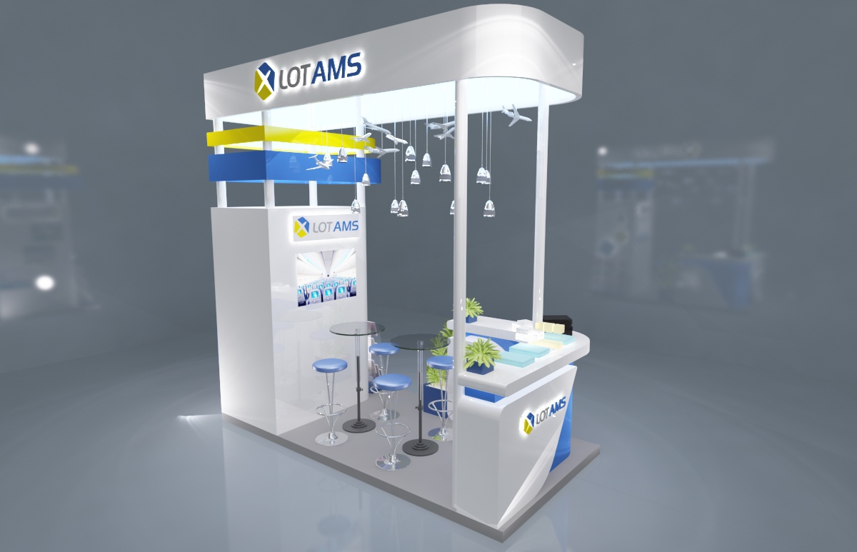Projekt zabudowy targowej dla firmy Lot AMS. 2 wersje stoiska targowego.